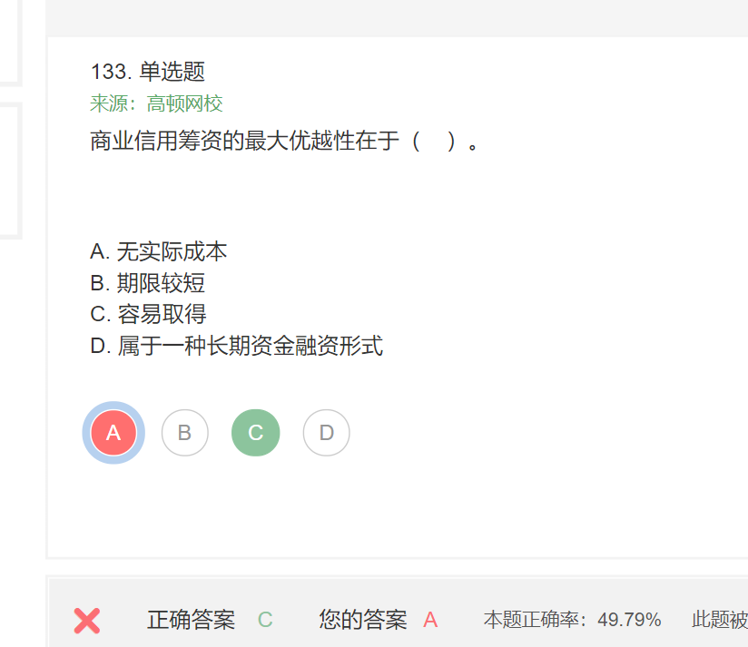 老师请问商业信用筹资不是相当于无息贷款吗,为啥A不对呢