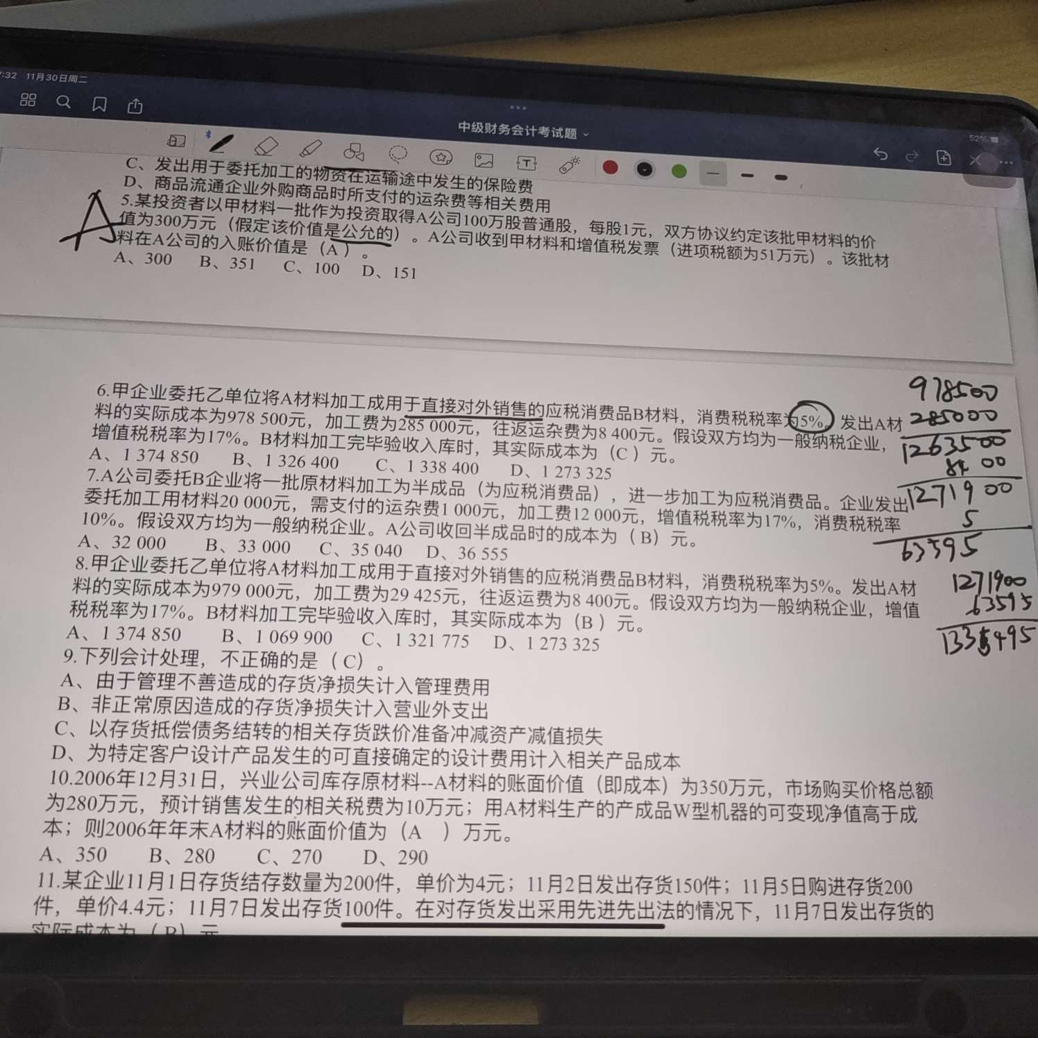 B材料实际成本=978500+285000+8400+66500=1338400(元)。
