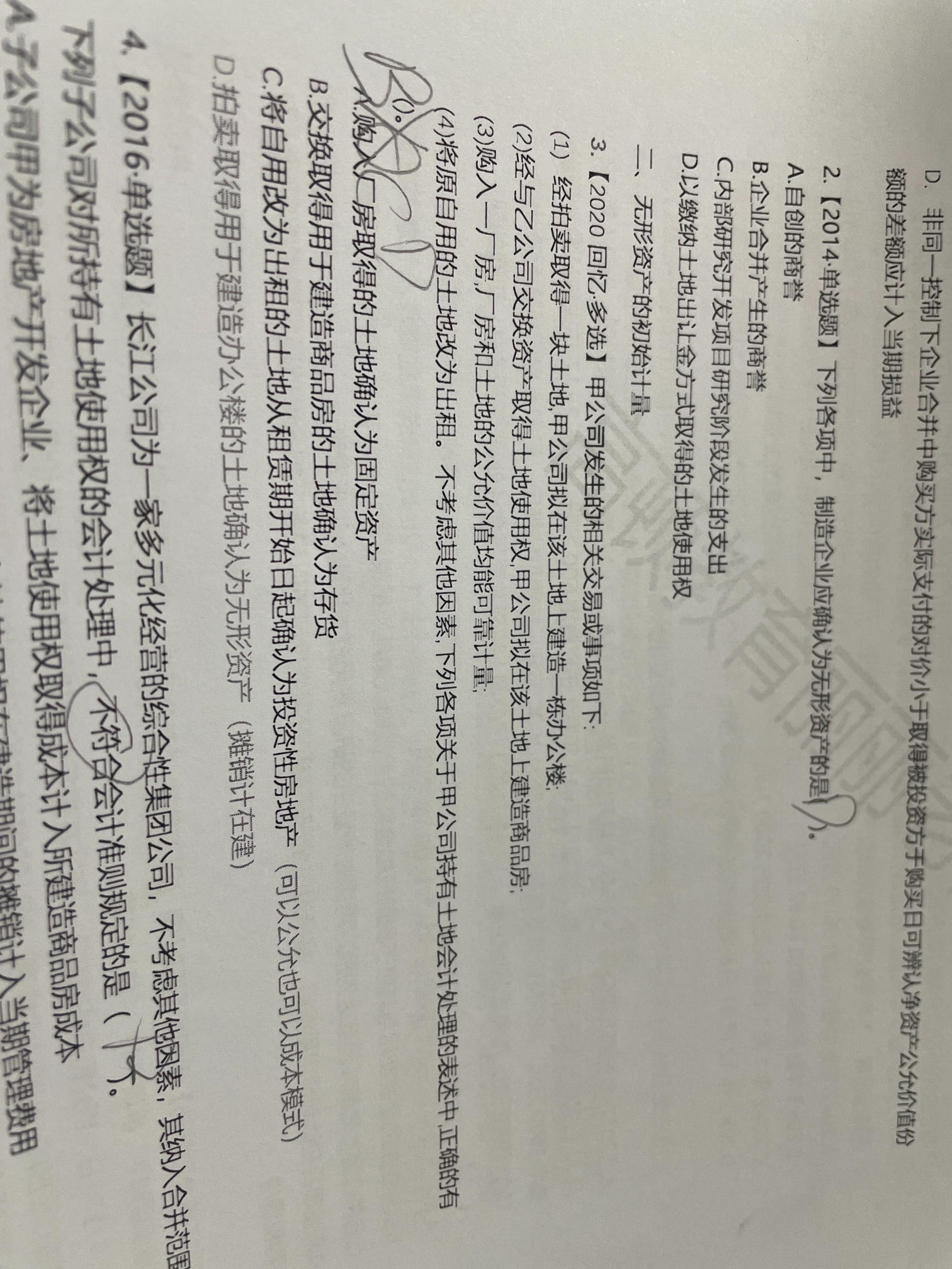 甲企业交换的土地使用权是用来建造商品房的,用于建造商品房的土地使用权计入“开发成本”。我们看企业经营活动的实质哈。