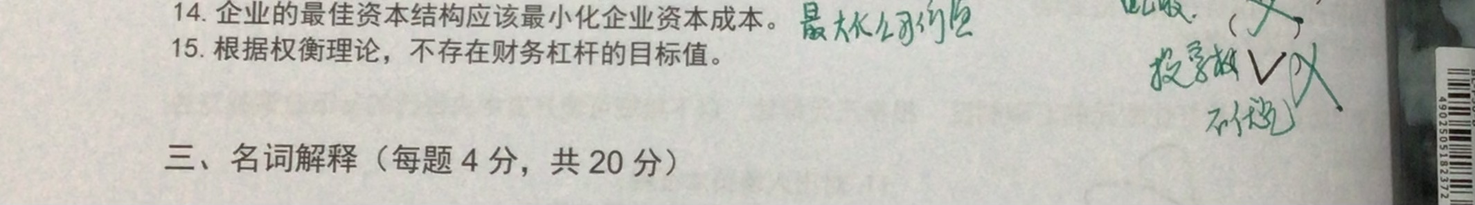 14题的答案后半句不就是题目吗? 15题 破产困境成本不好估计所以没有确定的资本结构,为什么会曾在目标值这种说法呢