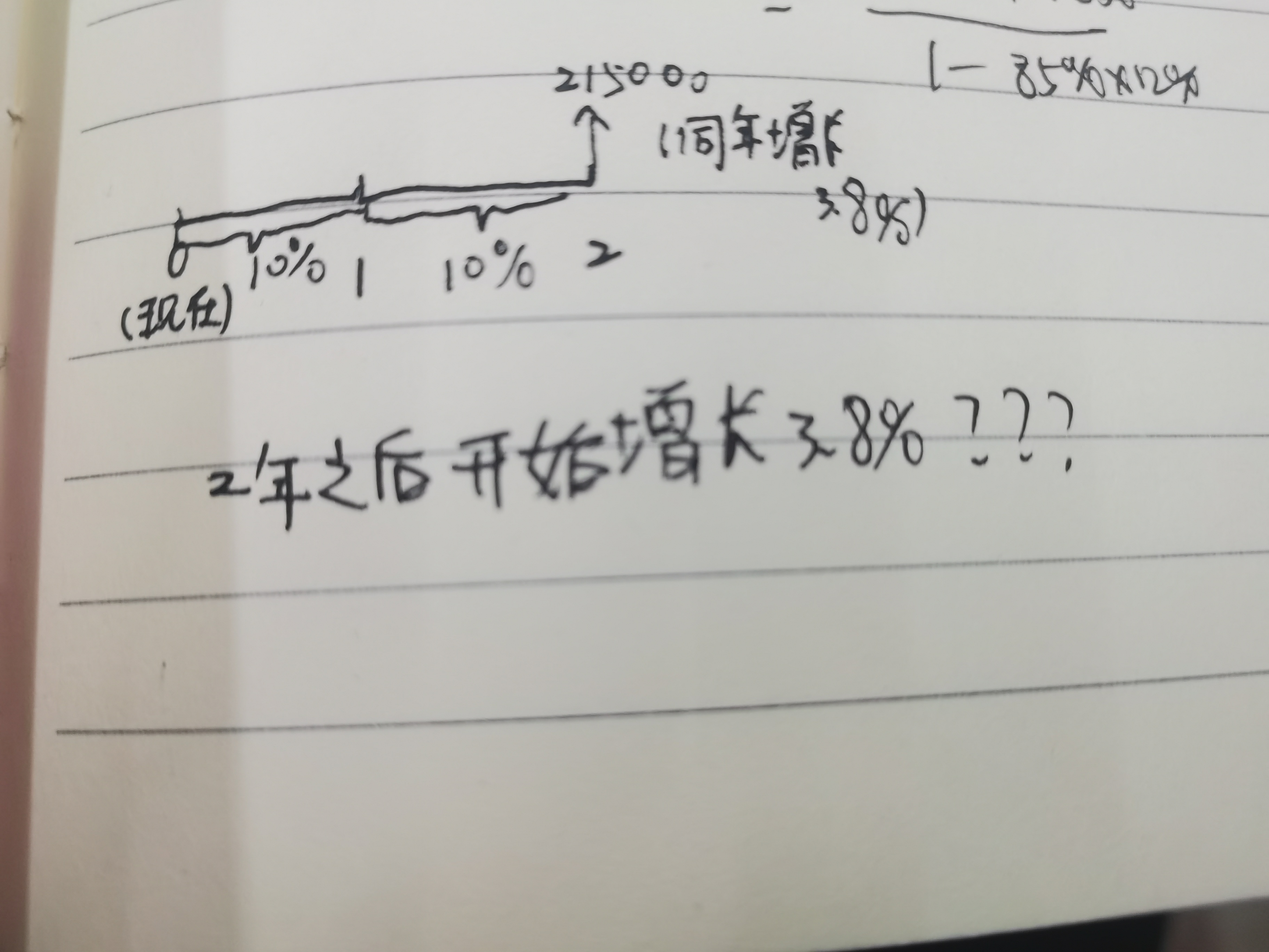 这是永续增长年金的算法,分母是折现率减去增长率,这个计算的结果就是永续年金的价值,这个价值是一年后的价值,因为是两年后才有的这个增长率。