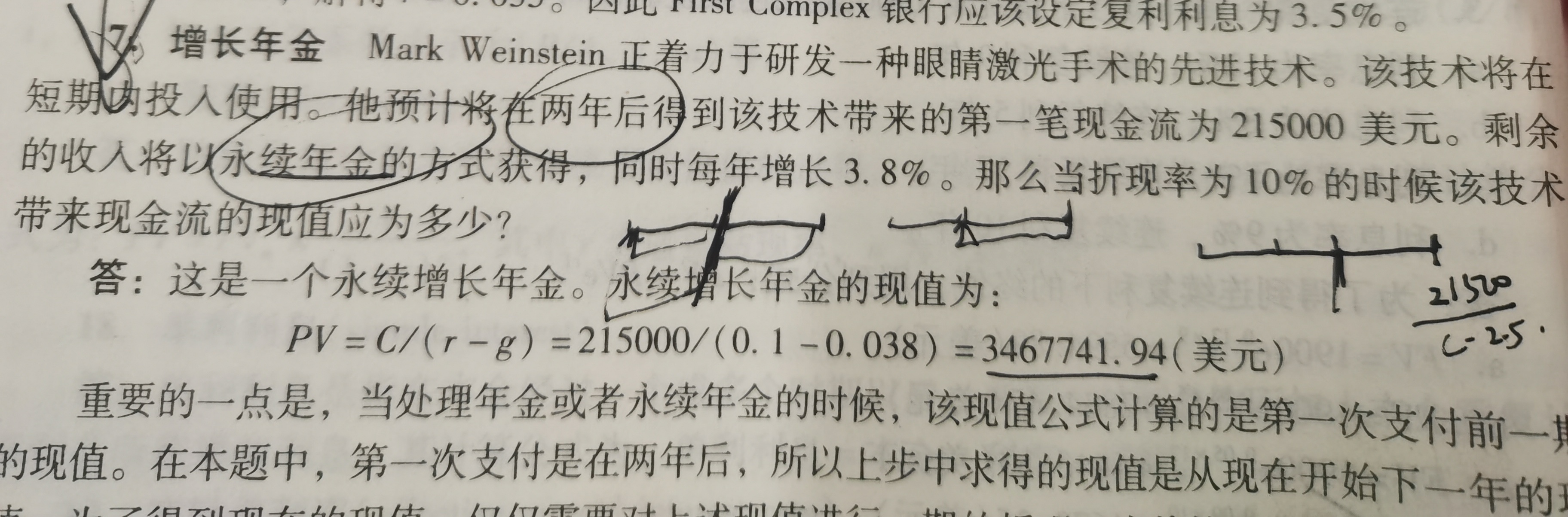 老师,这道题预计两年后得到该技术的第一笔现金流后,同时剩余的收入才开始算永续年金啊。每年增长3.8%,那么它之前的两年折现率应该还没有增长3.8%吧?为什么折第一年的现要减呢?