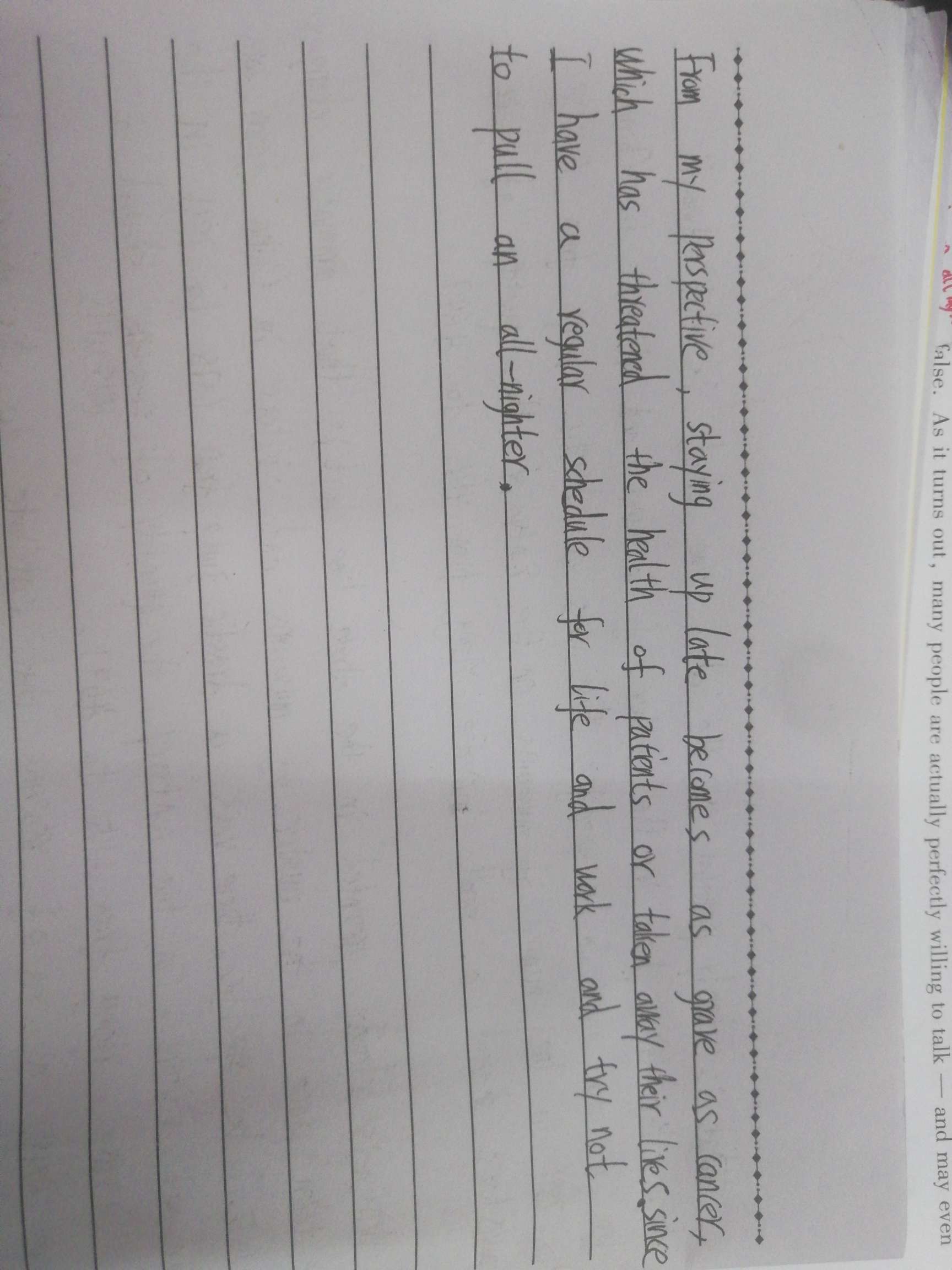 Q同学你好同学,提出一点个人建议:阐述熬夜的危害时,这里说和癌症一样严重,会稍微有些过头。后面提到了patients病人,熬夜的人不能称之为病人,可以说是night owl:喜欢熬夜的人;夜猫子(owl的意思是“猫头鹰”,在英语的表述中,“猫”变成了“猫头鹰”,不睡觉的人就跟猫头鹰差不多,都喜欢很晚不睡觉。)