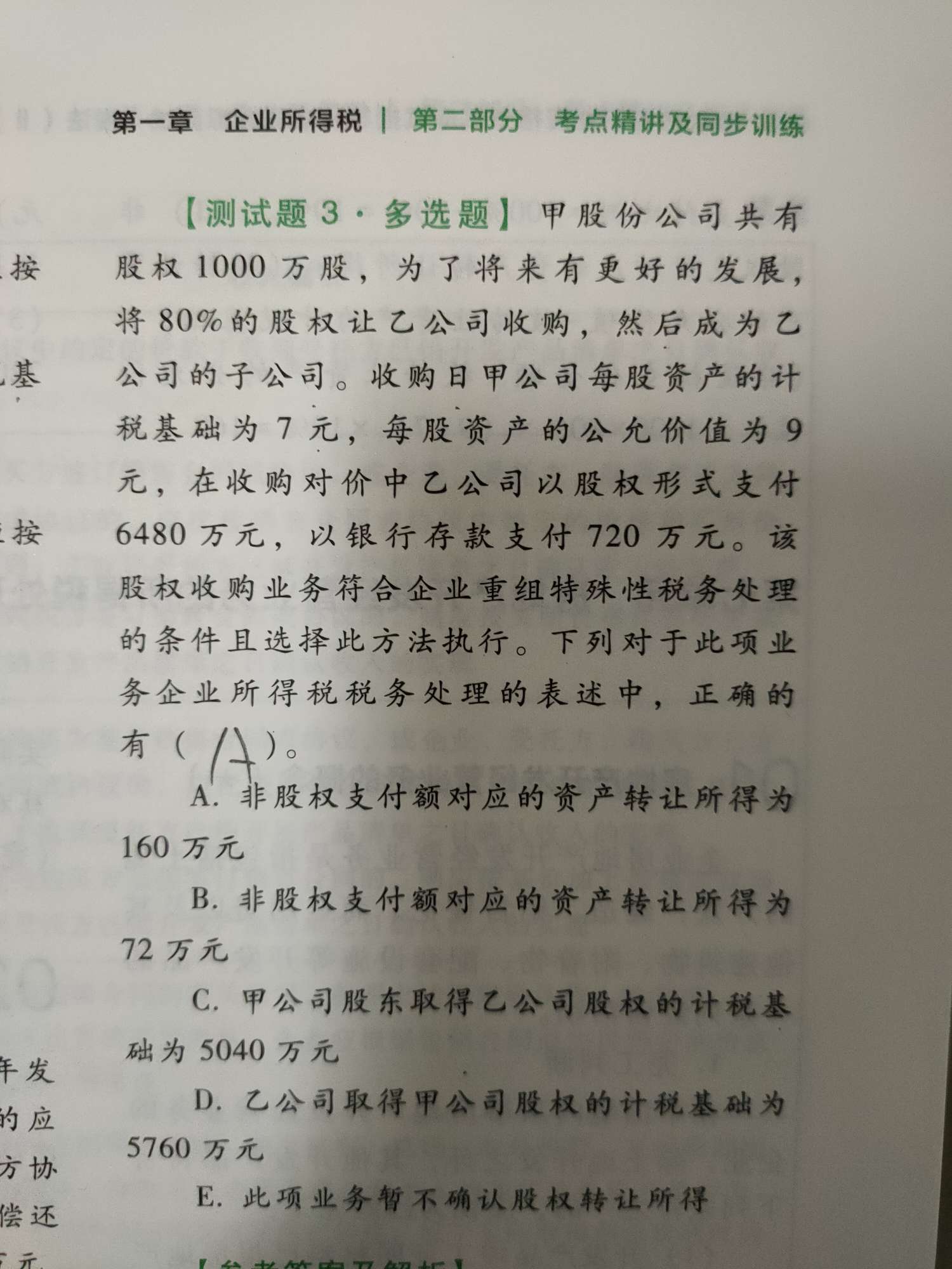 乙公司获得甲公司的股权就是基础也以原来持有甲公司股权计税 720+1000*0.8*0.9*7