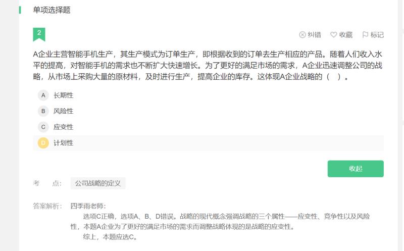 我们在做战略题时,应该注意题目中的核心内容,题目中说的是订单增加,A公司“迅速”调整战略,那就是应变性。(反应迅速)