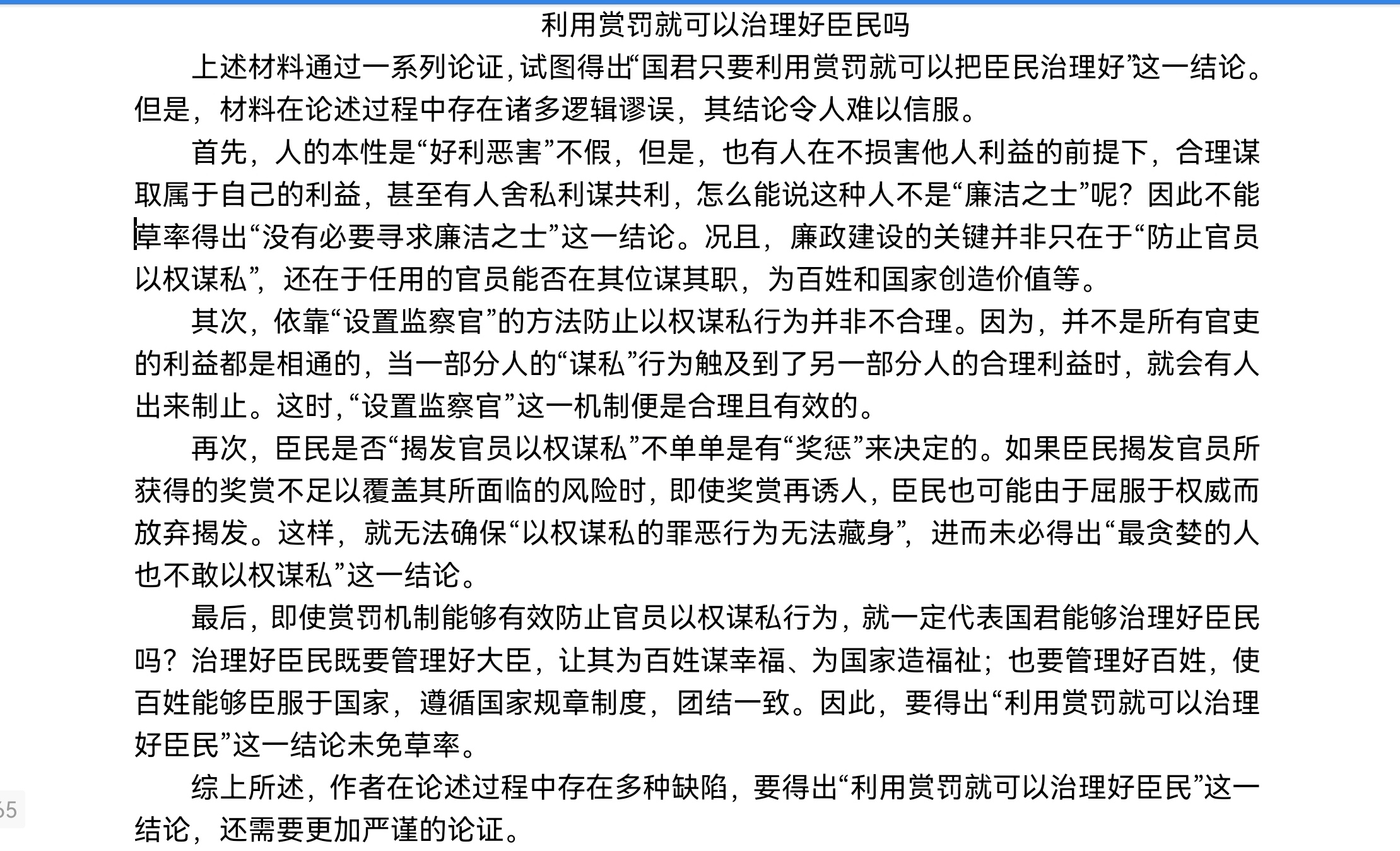 1、原文还有漏洞:人性“好利恶害”不代表人人都会“追赏逃罚”。