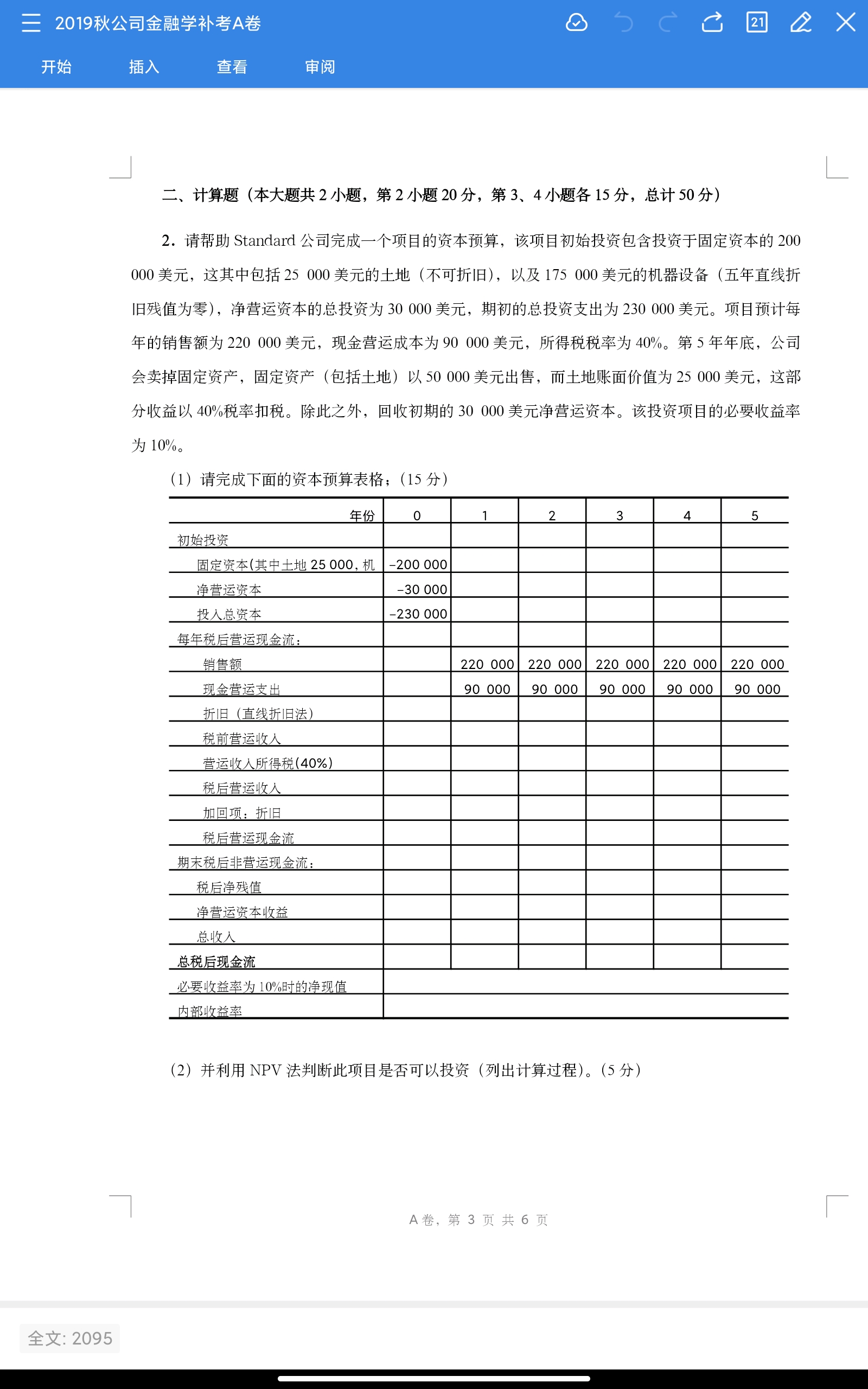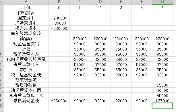 同学您好,图有点不清晰,时间比较紧我就把各年现金流计算了,期末50000的售价减去土地残值25000还有25000,交完税的税后现金流为15000,折旧是175000/5