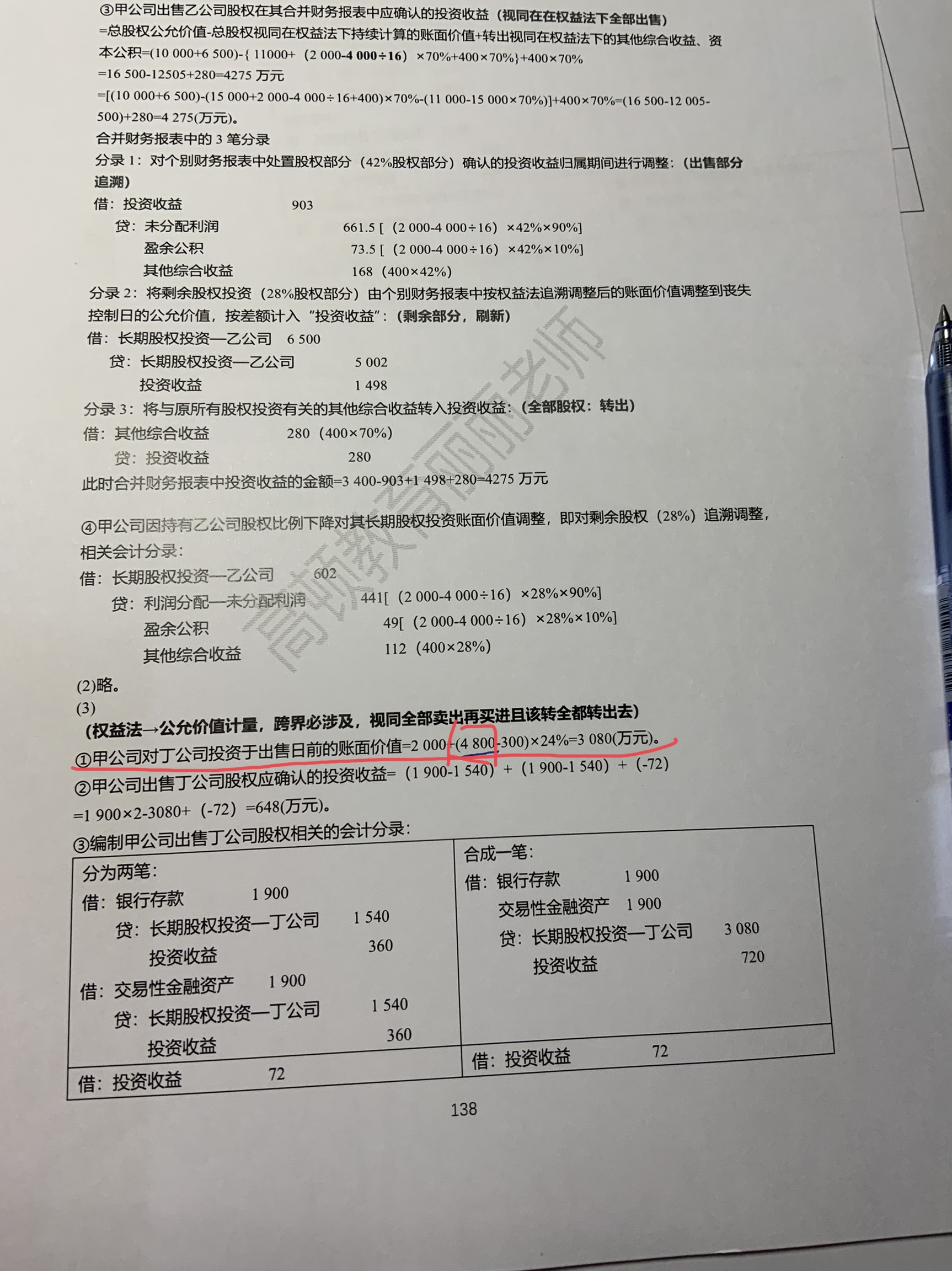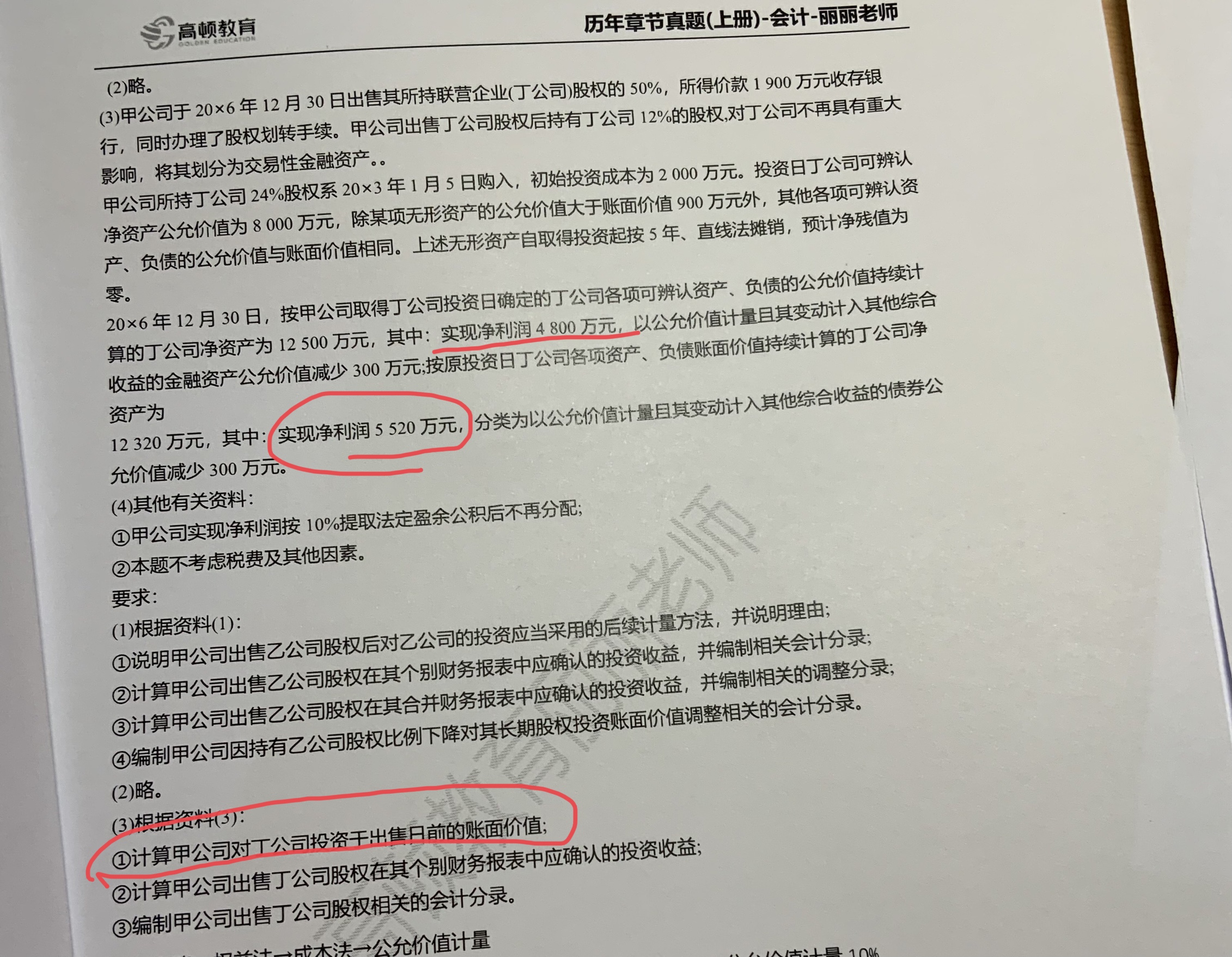 本题题干信息比较特殊,表述的不是当年的净利润4800/5220,而是至出售日,实现净利润4800/5220,这个净利润是截止到出售日的累计数,那么计算公账差的话需要考虑从取得日到出售日,公账差的影响累计数。