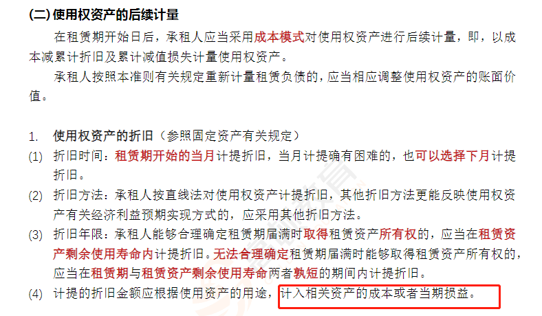 对于使用权资产后续折旧,根据租赁资产的用途,记入了相应科目,符合权责发生制