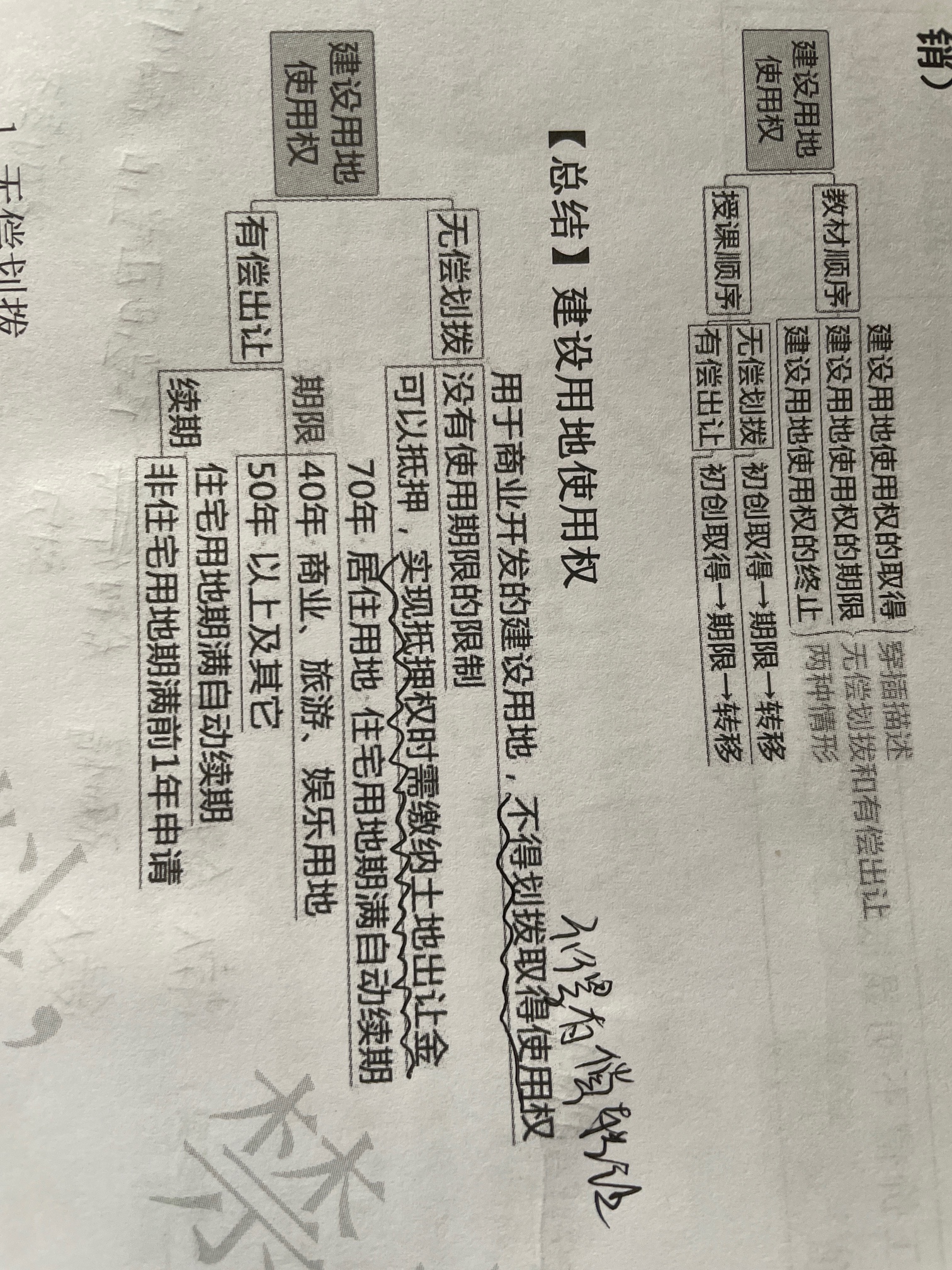 1.在同学传上来的这个知识点上,不得划拨取得使用权的意思是,商业用地政府不得免费提供,就算是无偿划拨的以后也是可以转让的,只不过要优先交给政府相应的土地出让金。
