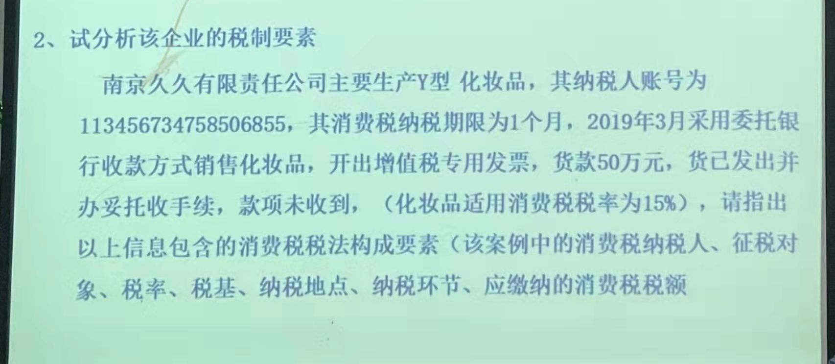 南京久久是纳税人,15%是消费税税率,税目是化妆品(就是征税对象),税基就是货款,消费税纳税环节为生产环节。仅供参考,以课程老师所讲内容为主哈。