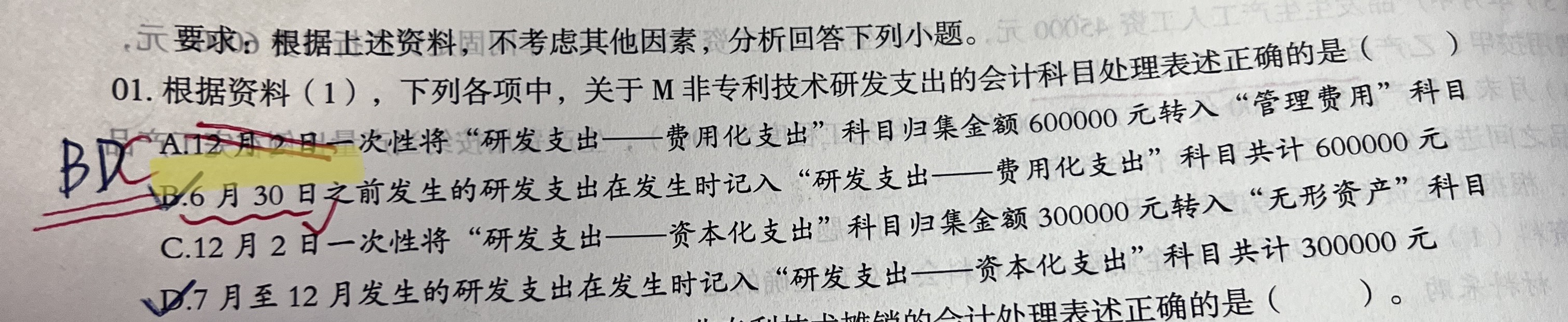 杨同学同学,改为1-6月各期发生支出的期末对费用话支出转为管理费用才正确。题干没有表述费用化支出仅仅在6月发生