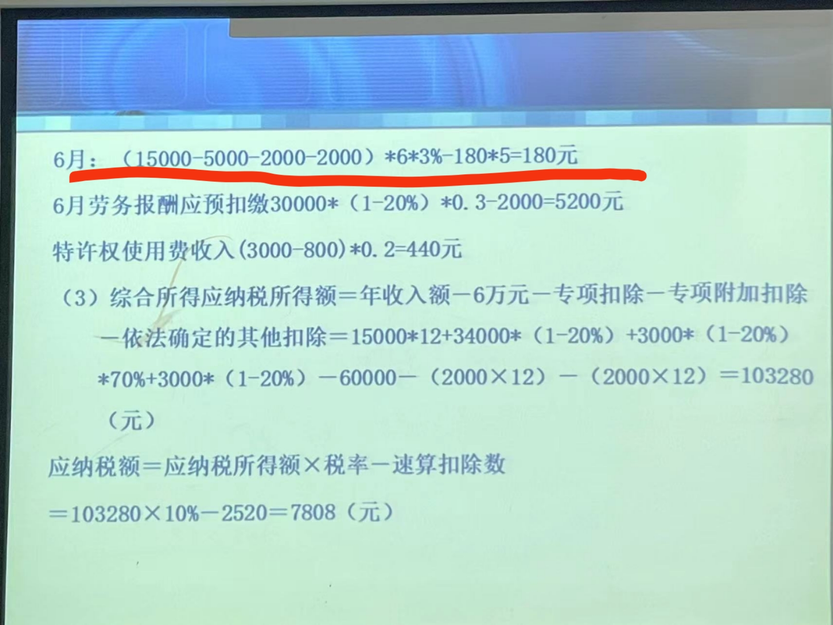 此公式是为了计算6月份预扣预缴的工资薪金个税,括号里面的是工资减去扣除项,乘以的6是6个月,3%是税率,减的180×5是前五个月交的个税,也就是减号前面的是6个月的税,减号后面的是前5个月的税,两者相减就是要求的6月份的预扣预缴的工资薪金个税。同学可以再将经济法第五章个税的内容复习巩固一下。