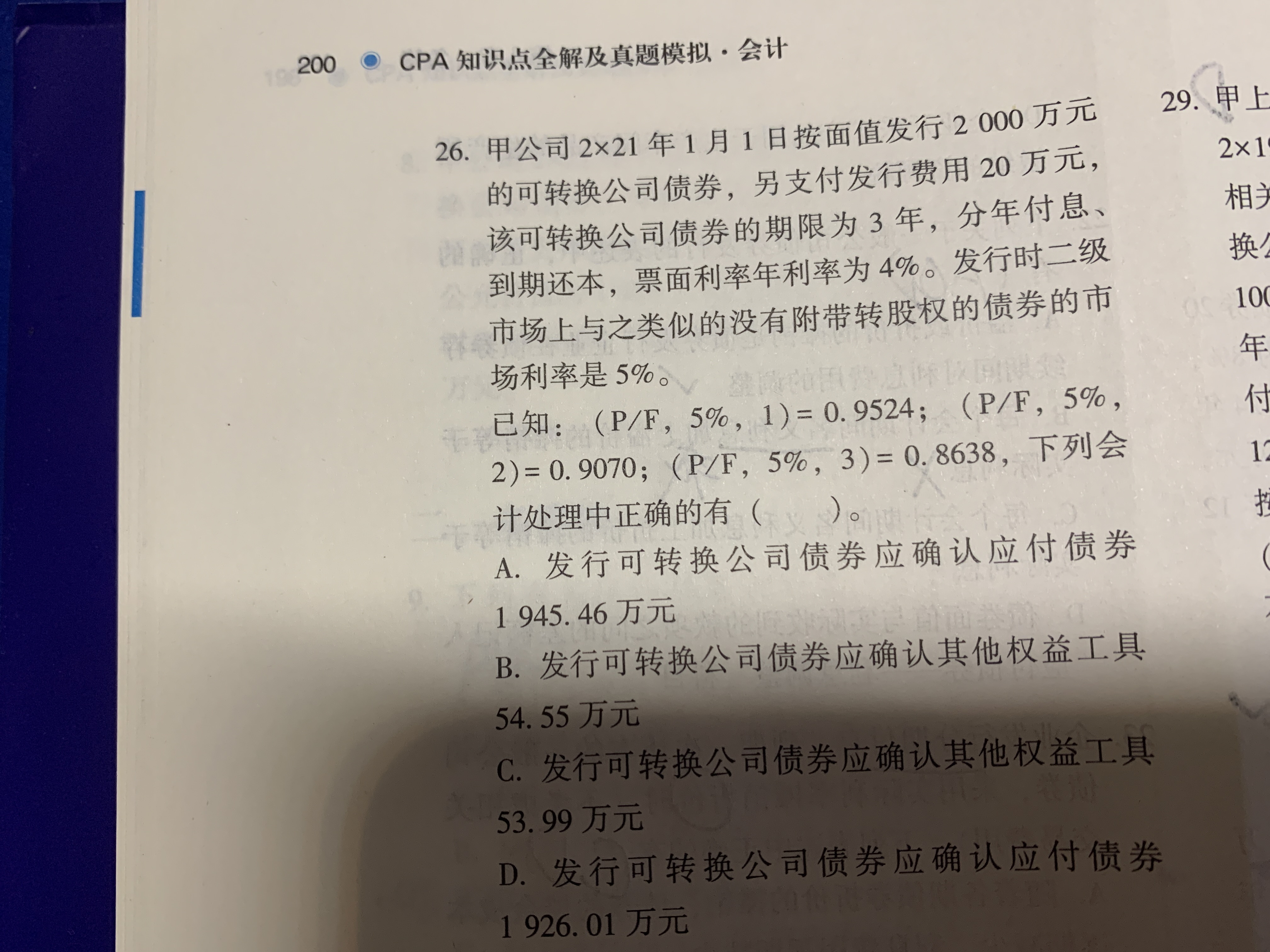 1,因为甲公司发行的是可转债,包含了负债成分和权益成分,先来计算负债成分的公允价值,需要把以后需要支付的本息按照实际利率进行折现,每年支付利息=2000×4%=80