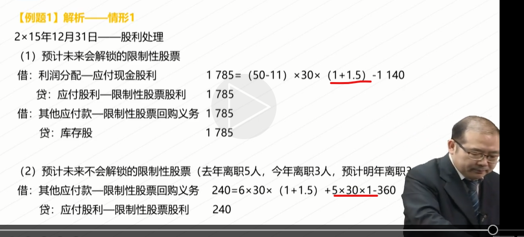 老师例题1限制性股票里,红笔画的为什么又要加一次5*30*1呢?是不是不会解锁的需要在后面几年,把前面的实际的股利都加上,然后会解锁的直接乘宣告发放的股利金额