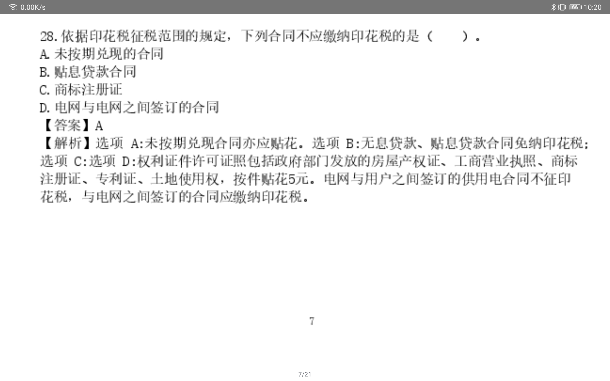 28题:老师觉得28题答案是选B。未按期兑现的合同也是需要按章征收印花税的,贴息贷款合同是免征印花税。