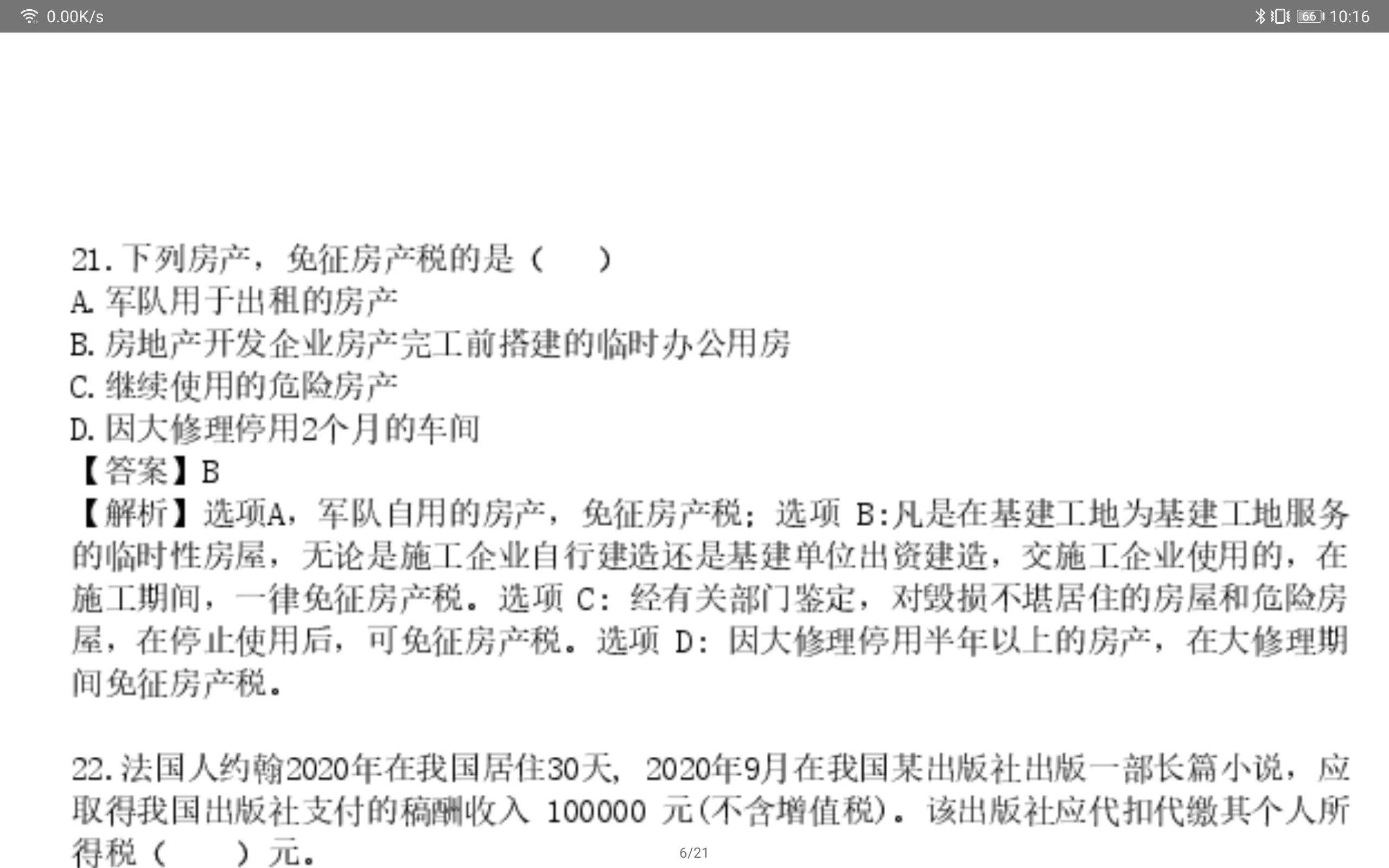 21题:军队自用的房产免征房产税,军队用于出租的房产,相当于用于经营性质,是需要缴纳房产税的。房地产开发企业完工前搭建的临时办公用房,具有临时性,免征房产税。