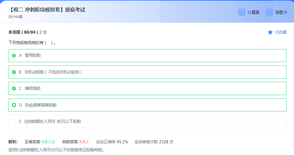 老师,税二摸底这道题,防疫避难隔离船舶,不用加“不上下客货”这个条件吗?教材中,好像是,“并不上下客货”也是条件,才能免税吧?考试就这么出题的话,这个答案是选还是不选呢?谢谢!
