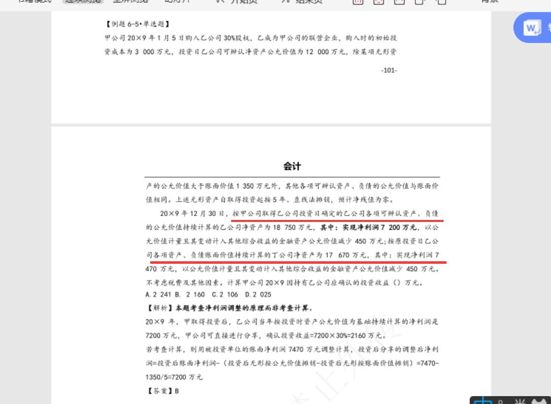 1、丽丽老师-教材讲义-第六章-例题6-5,详见图片。个报权益法中, 投资方认可的净利润是“按投资日被投资方各项可辨认资产、负债的公允价值持续计算的净利润”。权益法的题目,一般是利用公式“调整之后的净利润=账面净利润-(按公耗-按账耗)-总的未实现+当期已实现”。调整的目的就是将“账面净利润”调整到“按投资日被投资方各项可辨认资产、负债的公允价值持续计算的净利润”。请问理解正确吗? 2、例题6-5。题中条件“按原投资日乙公司各项资产、负债账面价值持续计算的丁公司净利润7470”,各项资产包含商誉,这段条件需要加“可辨认”三个字吗? 3、个报权益法中,随着被投资方长大,投资方认可的被投资方的账面价值=投资日可辨认净资产的公允价值+按投资日各项可辨认资产、负债的公允价值持续计算的净利润。理解对吗? 4、“各项可辨认净资产、负债的公允价值”与“可辨认净资产的公允价值”是一个意思吗? 5、可辨认净资产的公允价值是以可辨认净资产的账面价值为基础考虑评估增值和减值之后的结果,即“可辨认净资产的公允价值=可辨认净资产的账面价值±(存货/固定资产/无形资产)评估增值或减值”。理解正确的吗?