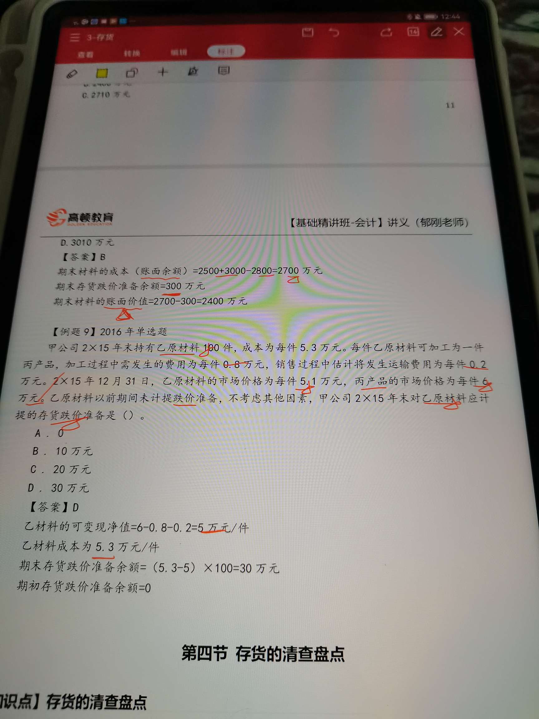 乙原材料不是全部用于生产丙了吗?不是直接按完工品丙的跌价准备...
