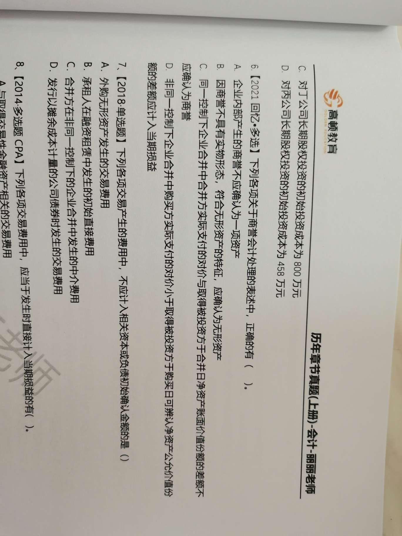 第六题D选项有疑问,非同控里 合并成本不是应该倒挤吗?贷方会有损益科目,没有差额的吗?,怎么D选项里说有差额呢