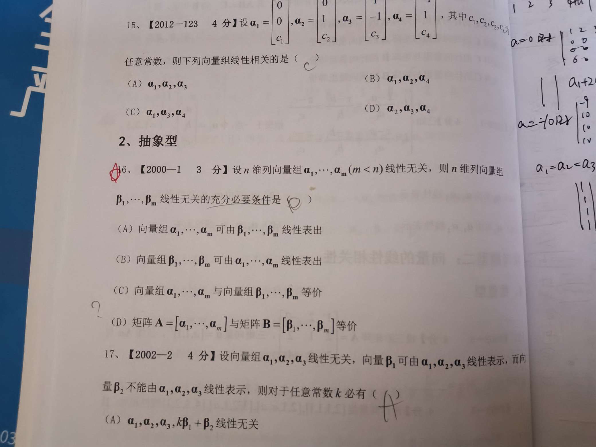 老师好,第六题,我选择的是正确的,但是对于CD看答案还是有点搞不清楚,向量组等价和矩阵等价的区别。PAQ=B这个是矩阵等价