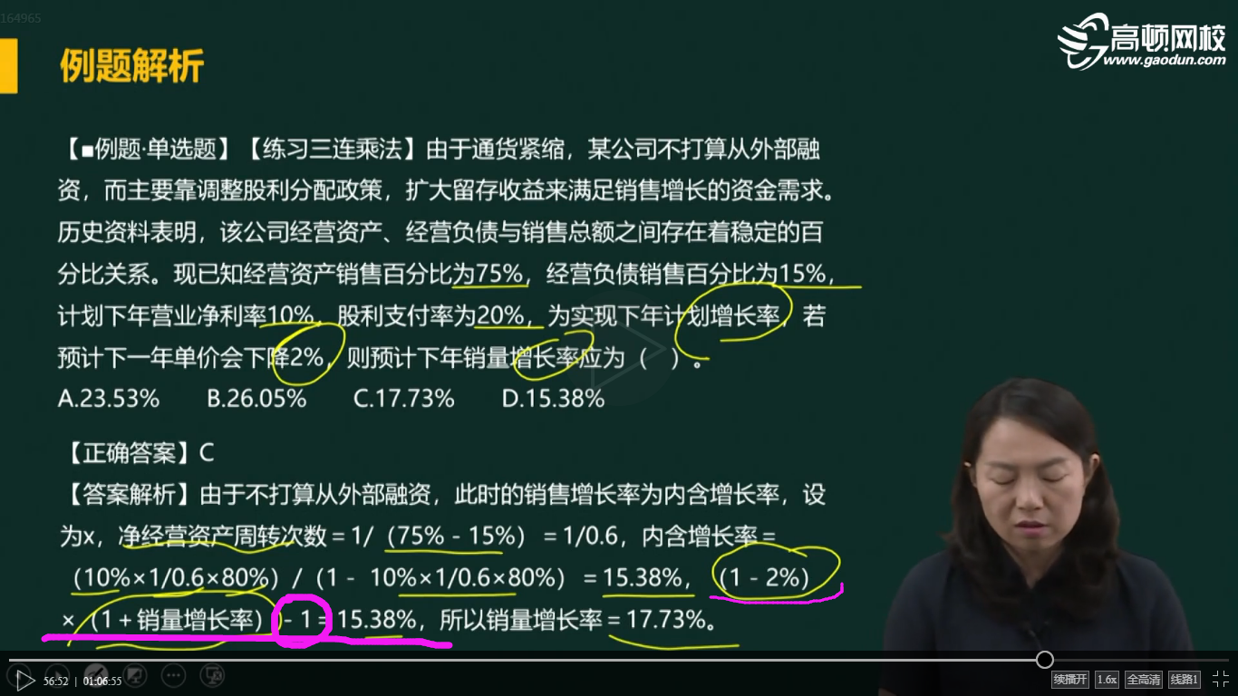 销售收入等于单价×数量,那么我们设基期为营业收入为1,那么单价为1、销量为1,所以下年单价为1-2%(下降2%),销量为1+X(变动率设为X)那么,销售增长率=[(1-2%)×(1+X)-1]/1=15.38%,求解X即可。