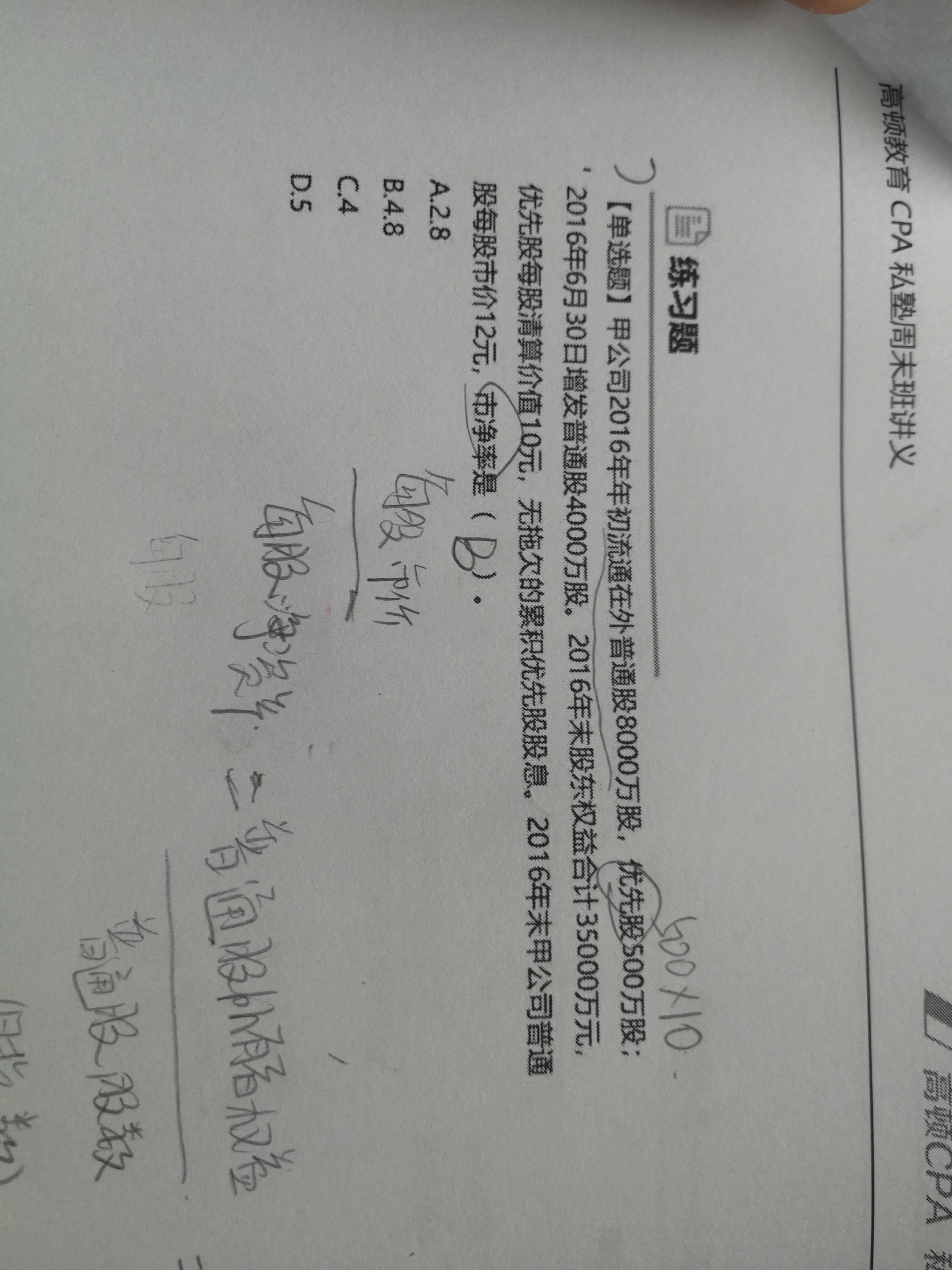 普通股股东权益=35000-500×10=30000(万元),每股净资产=30000/(8000+4000)=2.5(元/股),市净率=12/2.5=4.8