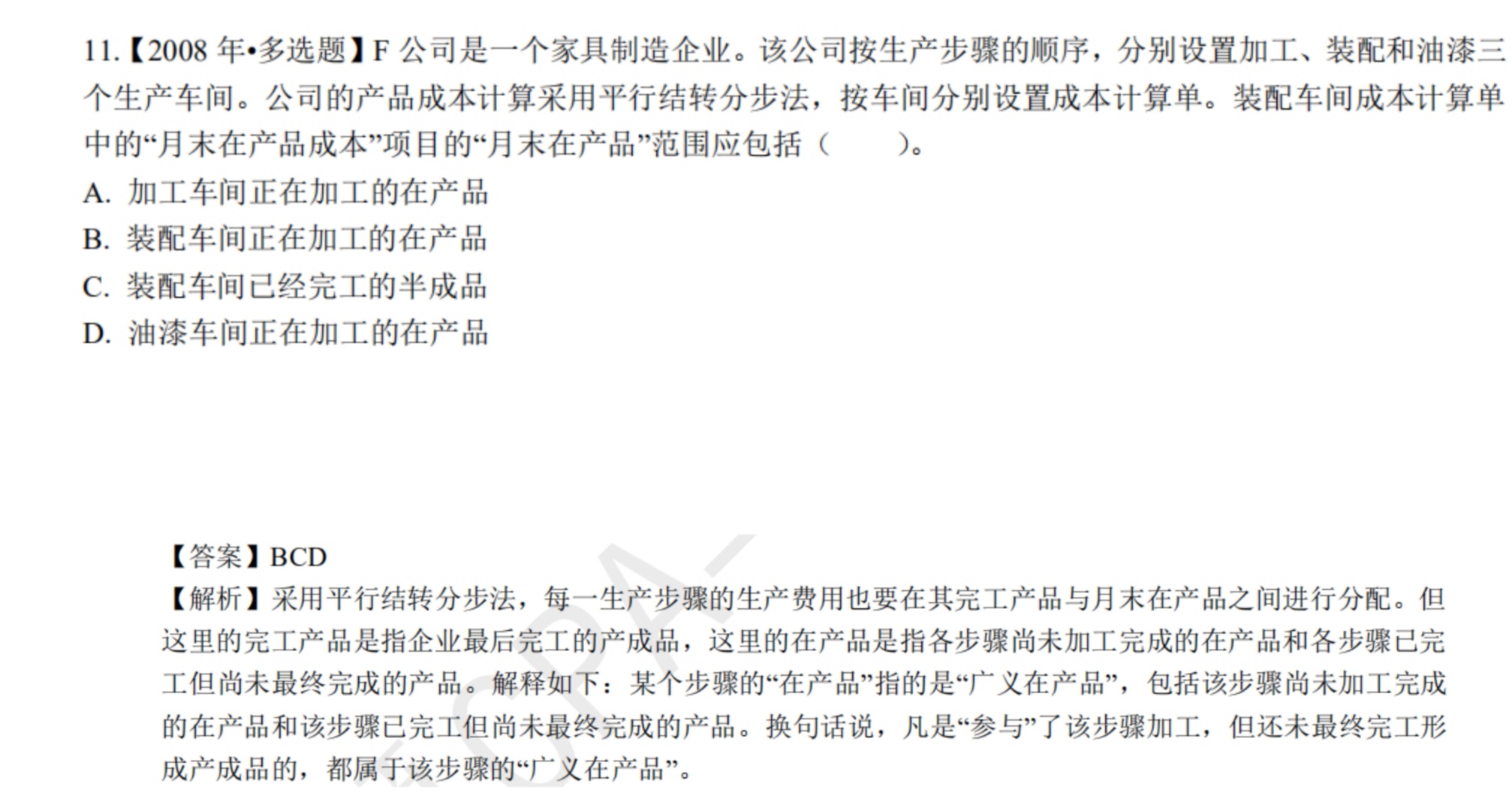 这里让求的是装配车间的月末在产品,选项A:还在加工车间加工的产品还是属于加工车间的在产品,不属于装配车间的哦~