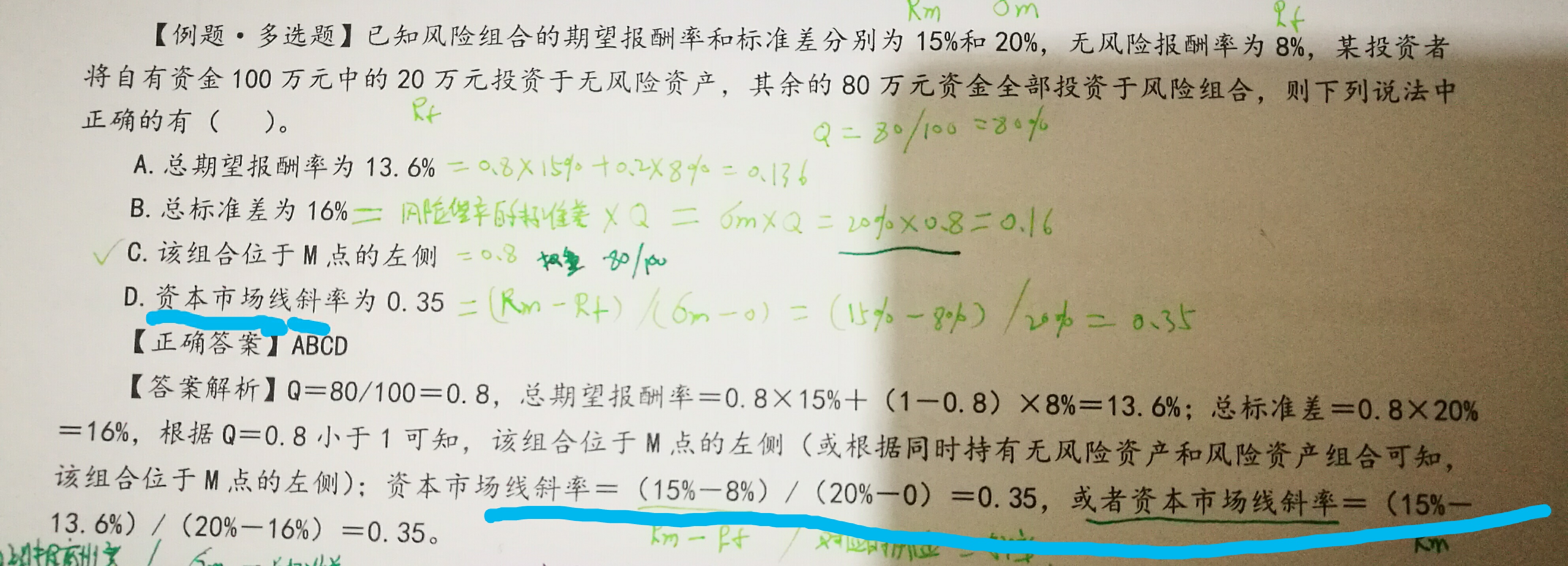 因此,资本市场线的斜率=(风险组合的期望报酬率-无风险利率)/(风险组合的标准差-总标准差),由于总标准差=0,所以有图二这个公式。