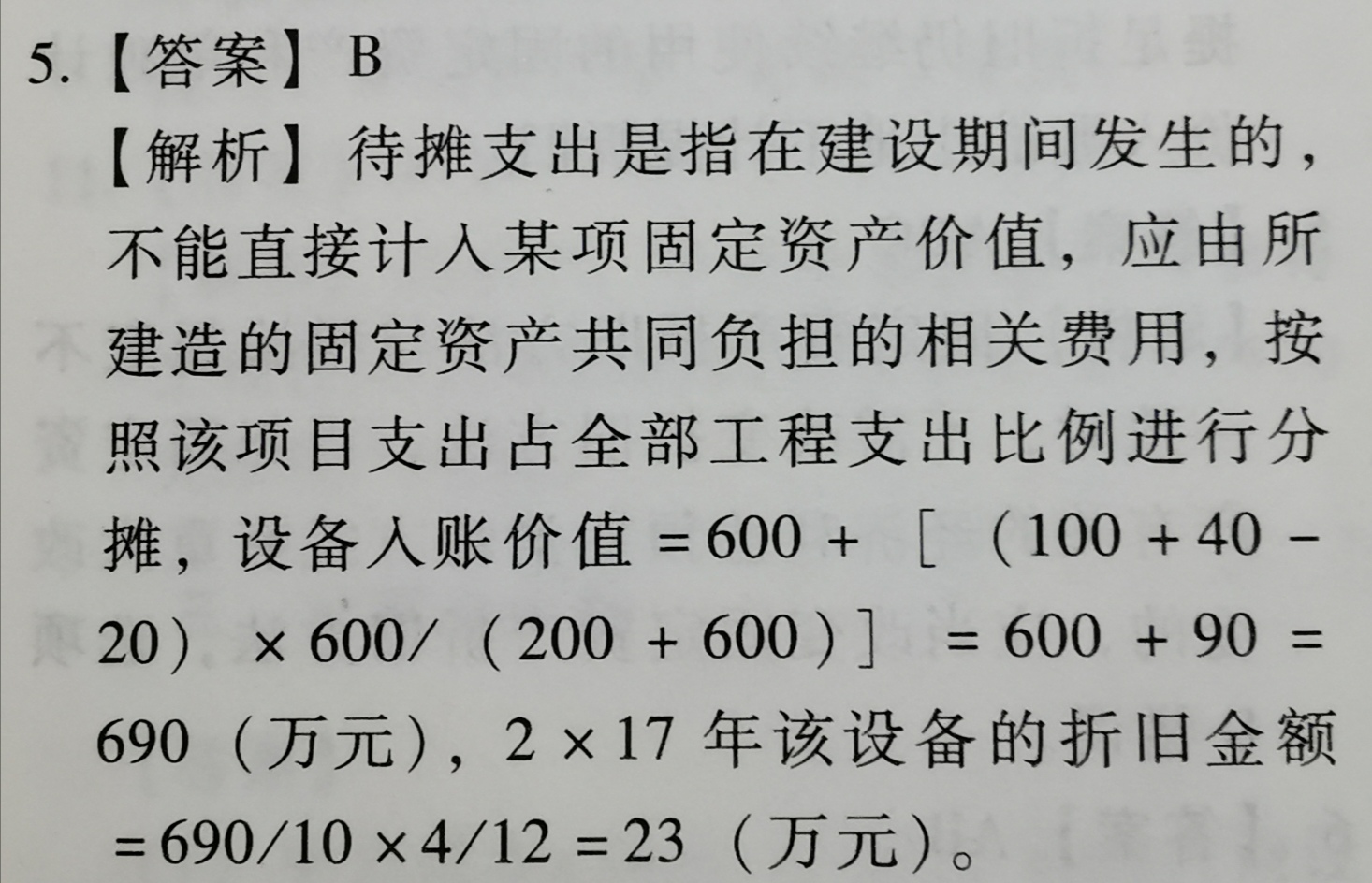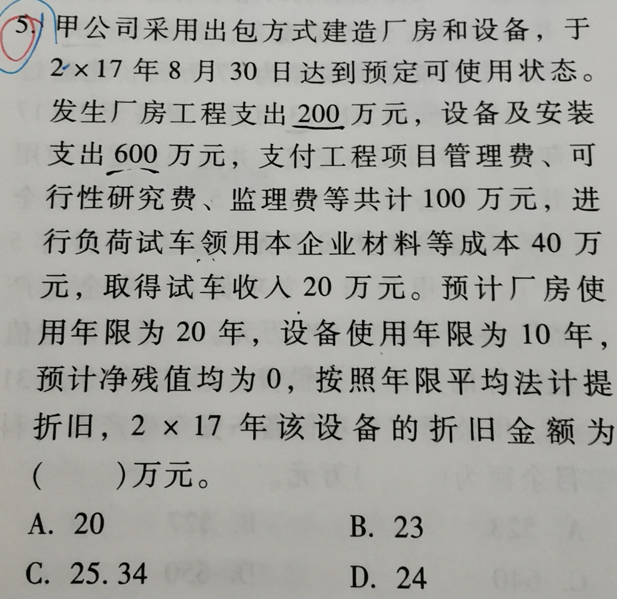 试车收入冲减在建工程成本;因为这里是只要求求出设备的折旧但是总的支出是100+40-20,没办法区分这里面哪一部分是设备的哪一部分是厂房工程,因此只能用600/(600+200)比例来求
