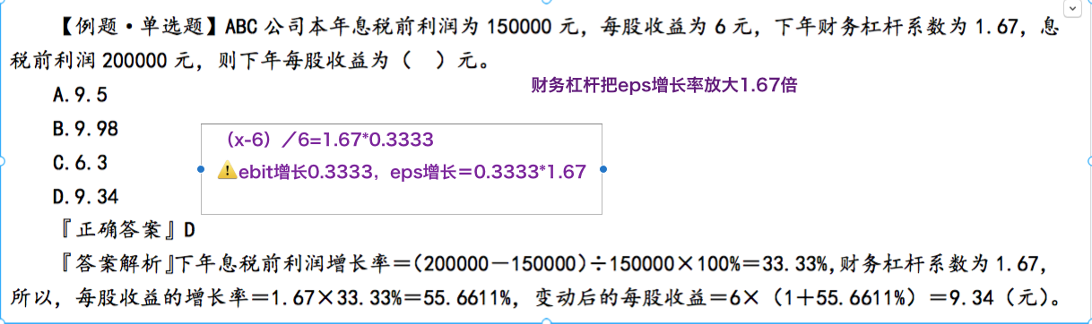 老师,dfl是ebit的小幅变化引起eps的大幅变化,例如图4,但2017这个题的eps变化为啥不是ebit变化的1.53倍?ebit变化=(1740-1305)/1305=0.33, EPS=(1740/500-1305/500)/1305/500=0.33,变化一样,麻烦老师看一下我这个哪里错了,多谢