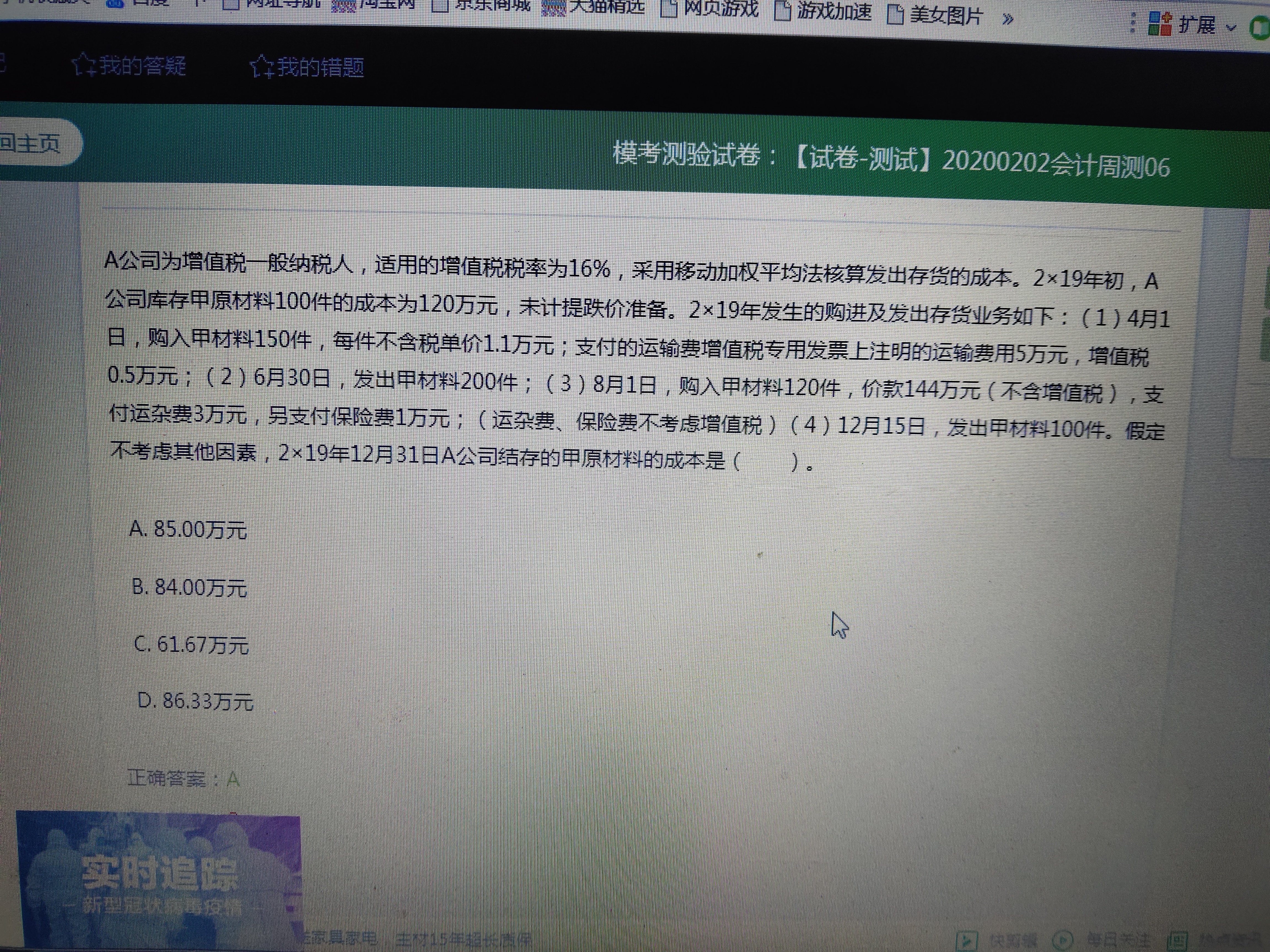 老师,您好 请问这道题能不能 用1.2170(期末剩余存货)=84.7 四舍五入为85呢