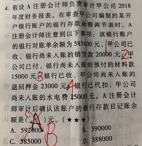 本题中,给出的是银行对账单余额585000,所以要调节的也是对账单上没有登记的金额(第1、2项),3、4项已经登记就不用再考虑了。