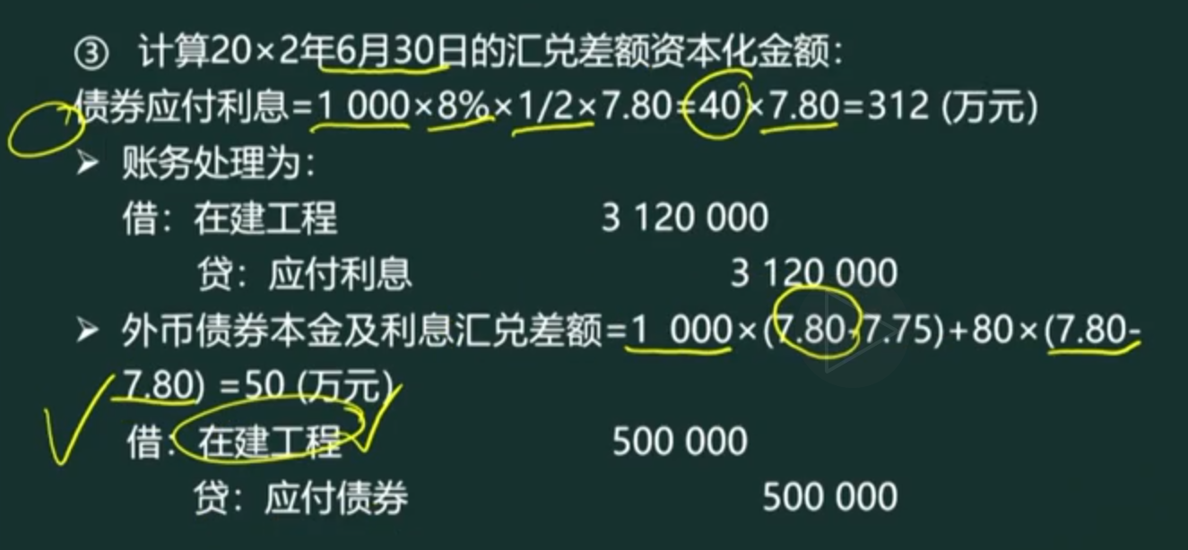 在20X2年,应付利息是美元40万,为什么计算汇兑差额时,用的还是80万呢?