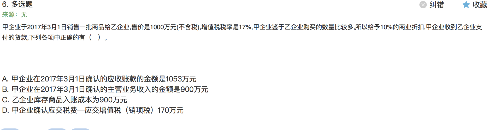 可抵扣的增值税不计入产品成本当中哦,所以题目中乙企业库存商品的入账成本为扣除商业折扣后的金额900万元。