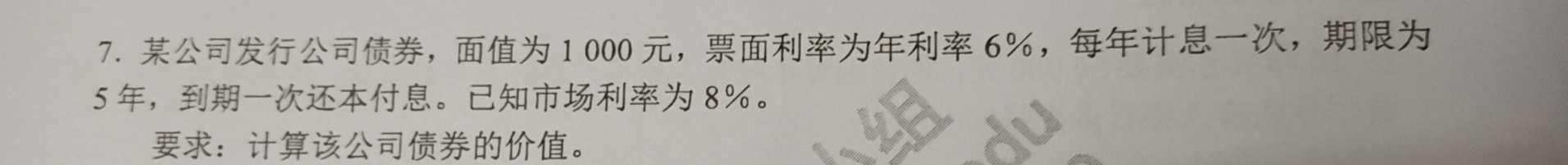 债券的价值=1000*6%*(P/A,8%,5)+1000*(P/F,8%,5),然后通过查系数表就能计算得出啦。