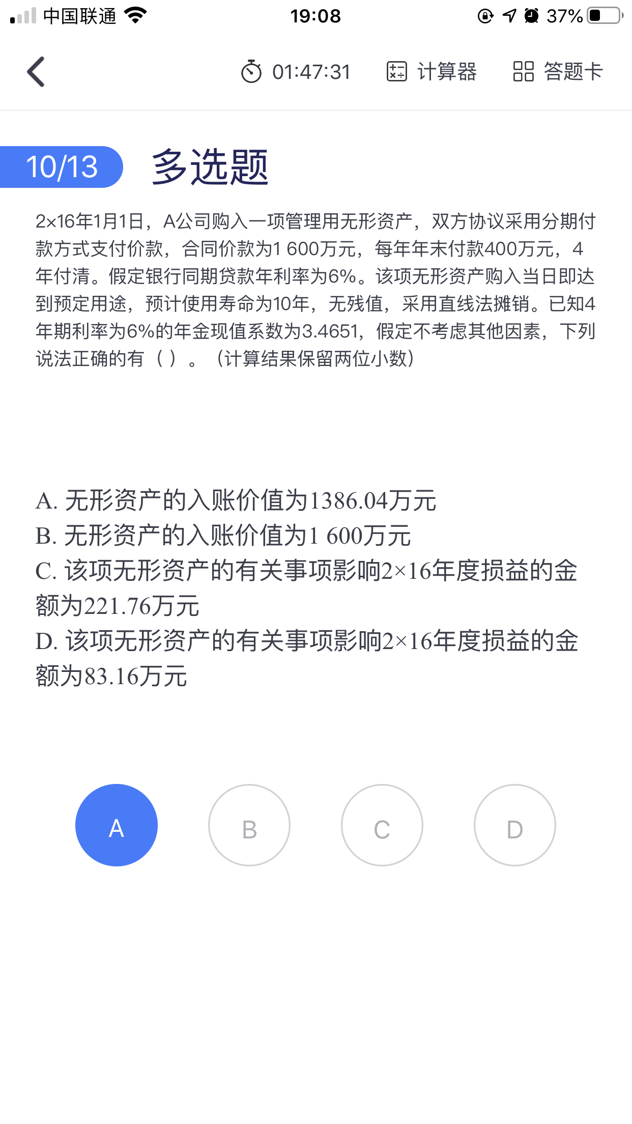 该项无形资产的入账价值=400×3.4651=1386.04万元,因为分期付款的话要根据现值计入资产的价值