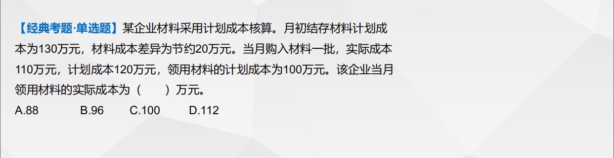 2根据计划成本计算领用材料的实际成本,实际成本=计划成本*(1+差异率)=100*(1-4%)=96
