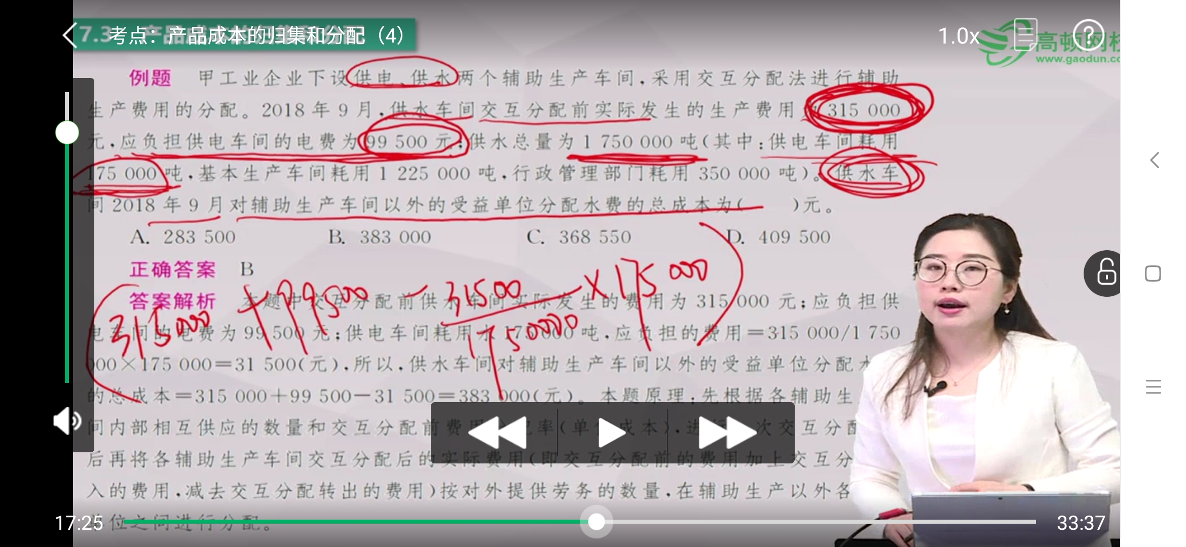 [/quote]本题计算方式为交互分配法,应当先将辅助车间内相互的费用进项分配。那么供水车间接收供电车间的费用99500应当加入后在对外分配成本