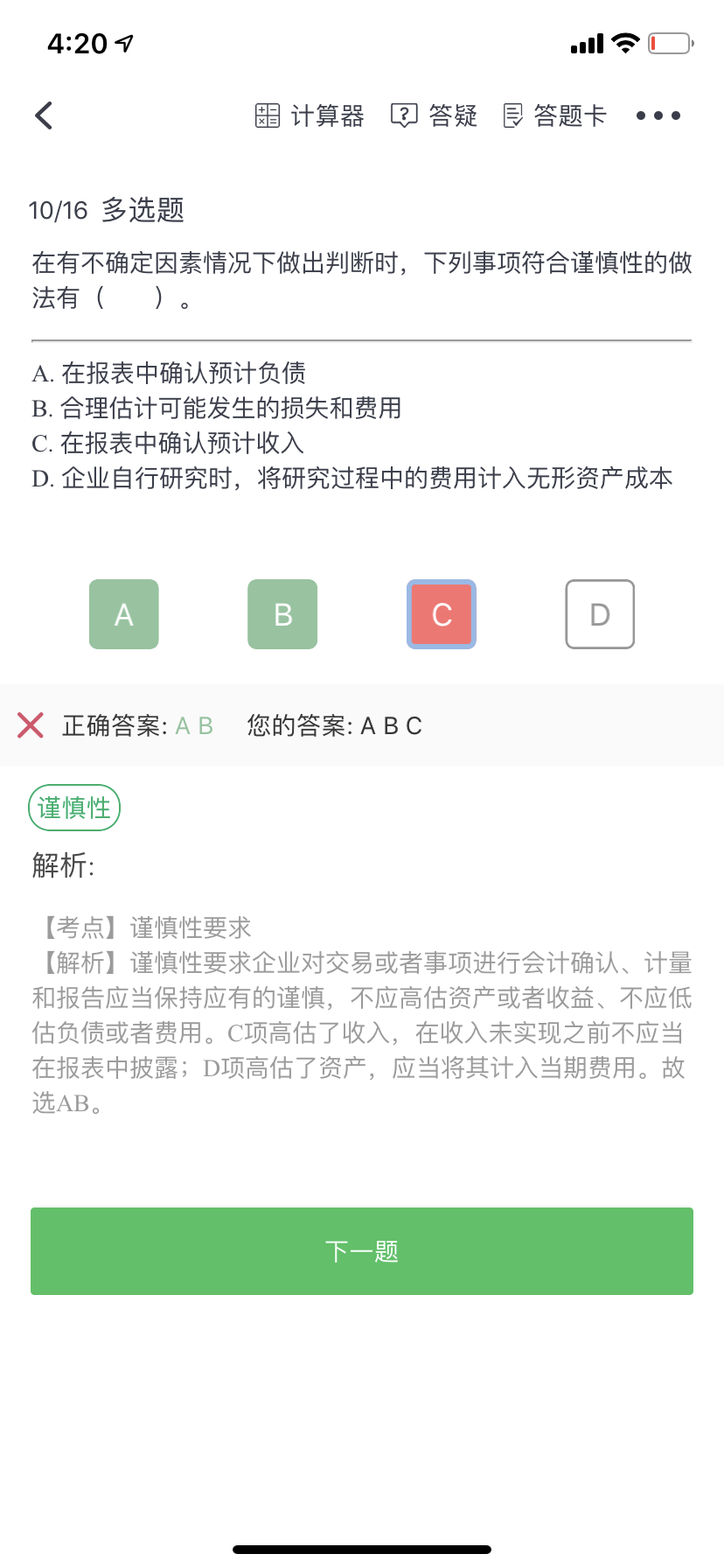 伊同学谨慎性要求企业对交易或者事项进行会计确认、计量和报告应当保持应有的谨慎,不应高估资产或者收益、不应低估负债或者费用。a能够可靠估计的确认预计负债。属于合理估计负债按谨慎性要求进行的账务处理。b合理估计可能发生的损失和费用符合谨慎性要求c预计收入后导致高估收益,所以不符合谨慎性要求d应当确认费用的金额计入到了无形资产,那么会导致无形资产金额的增加属于高估资产的内容,他不符合谨慎性要求,合理估计资产不得高估资产的具体要求