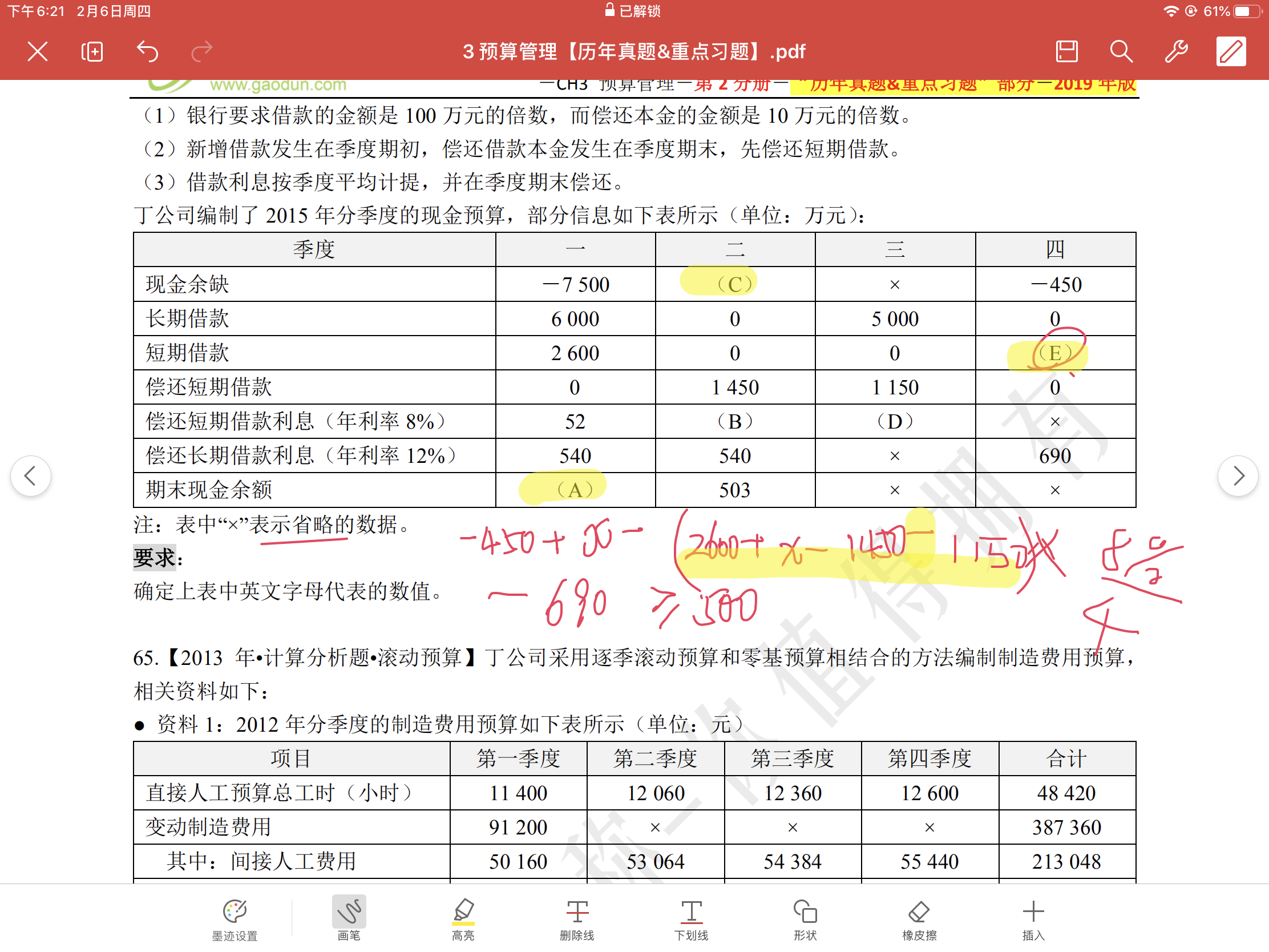 学员,你好!A一般不会等于C的。A是代表一的期末金额,只能说等于二的期初现金,C代表的是现金余缺=A代表的钱+赚来的钱-花出去的钱。E的话因为一借的钱在二、三期已经还完了,所以不用考虑了。