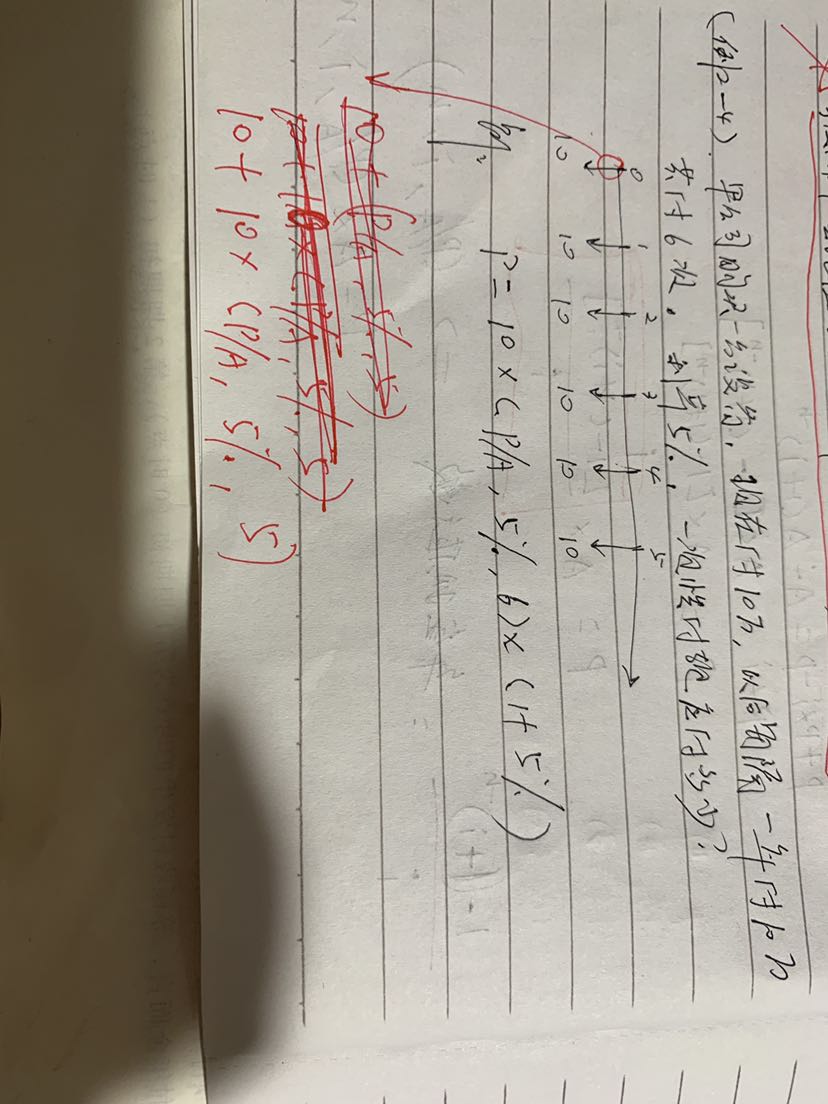 我的思路,这个答案应该是下面红笔写的,一个A再加5年的后付年金求出来,上面直接✖️(1+I)不能理解