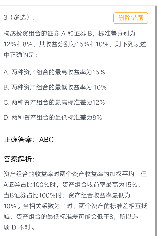 这个题不用计算,我们说组合会降低风险,而风险我们用的是标准差来衡量,所以两项资产组合后的标准差会比A\B中任何一个都要低的哦~所以这个D是错误的呢~