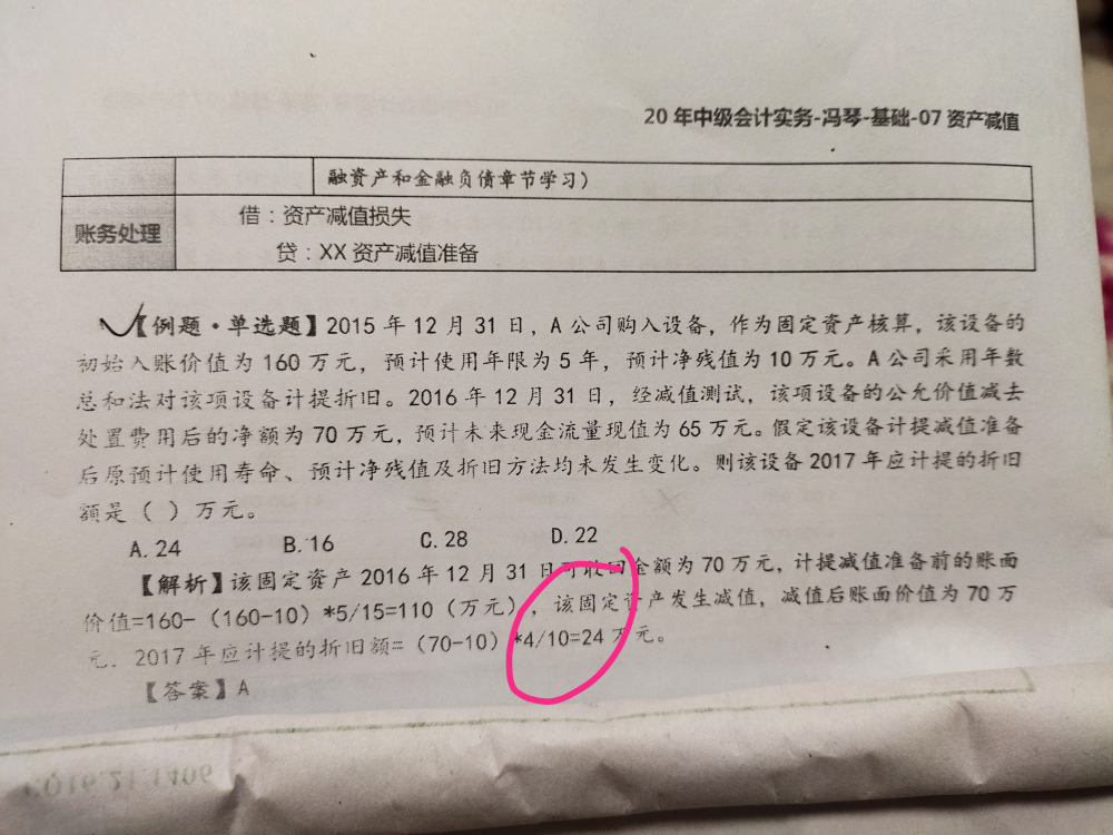 认真的同学你好减值之后重新估计寿命和残值,重新开始折旧摊销,预计寿命不变5年,使用了1年,还剩4年,所以应该是1+2+3+4