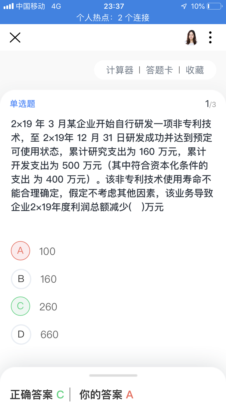 无形资产的研究阶段的支出160和开发阶段不能资本化的金额500-400=100,是计入费用的,也就是会导致利润减少,所以导致利润减少的金额是160+100=260。