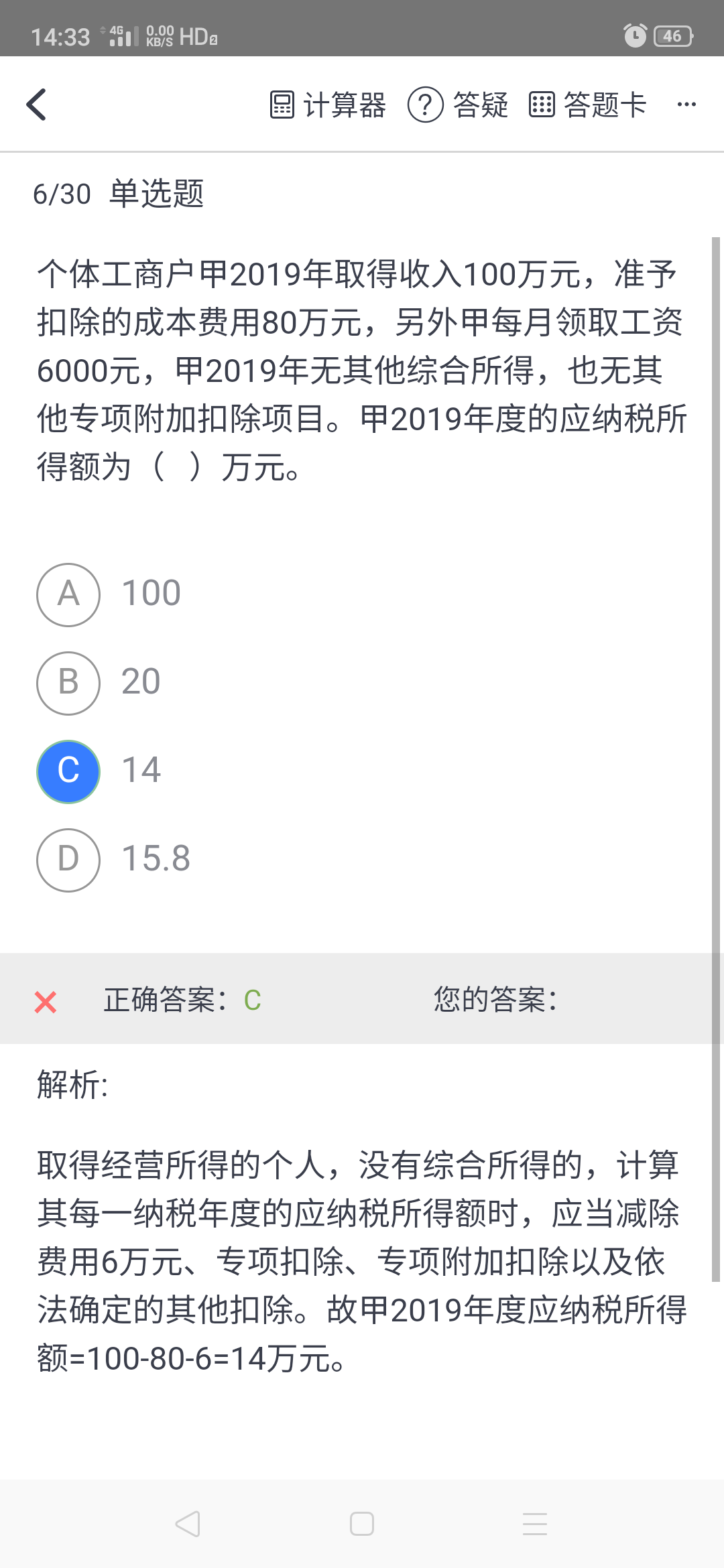 对呀,这道题是用20-18+8-6来算的,这个6万是要扣除的生计费呀,个体户的经营所得最后可以扣除6万的生计费之后作为计税依据的,这两道题不是一个考查点的哦~