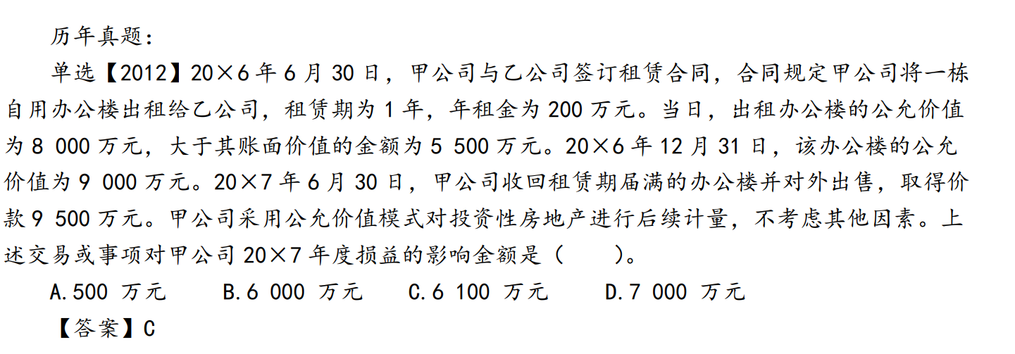 处置投资性房地产时,需要将自用办公楼转换为以公允价值模式计量的投资性房地产时计入其他综合收益的金额5 500万元转入其他业务成本的贷方,损益的影响金额=9 500-9 000+5 500+100=6 100(万元)。