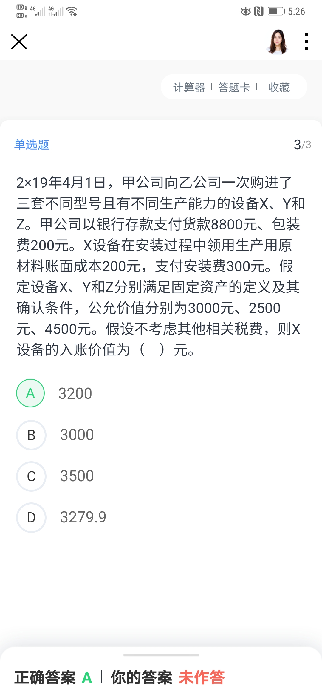 总共买入资产公允价值之和是3000+2500+4500=10000,甲占比3000/10000=0.3。购入总价款是8800+200=9000,所以甲占9000*0.3=2700,加上甲的原材料和安装费,甲的入账价值是2700+200+300=3200。