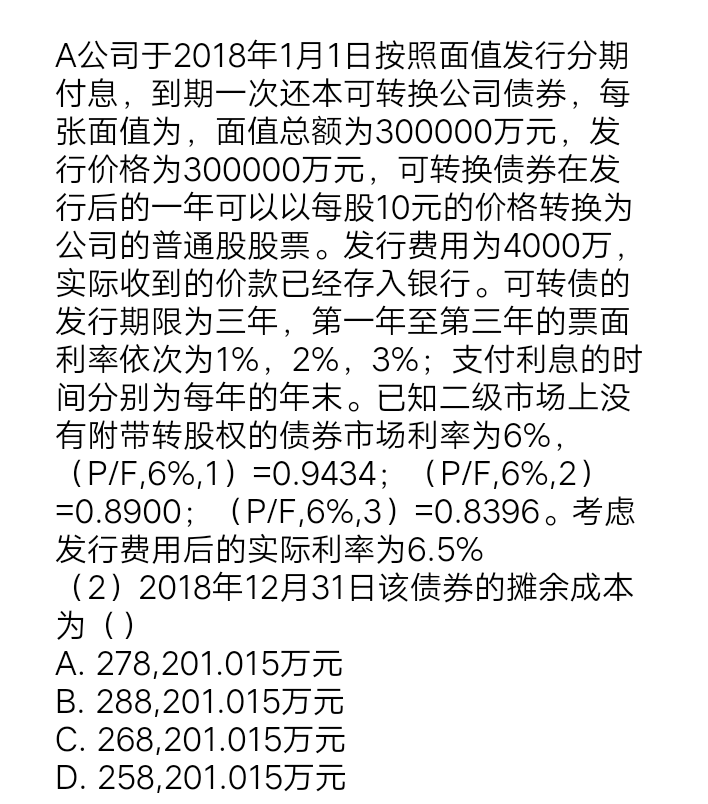 可转换公司债券负债成分公允价值=300000*(P/F,6%,3)+300000*1%*(P/F,6%,1)+300000*2%*(P/F,6%,2)+300000*3%*(P/F,6%,3)=300000*0.8396+3000*0.9434+600*0.8900+900*0.8396=267606.6万元